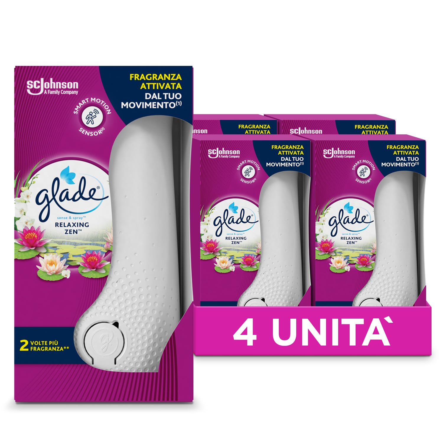 - La confezione contiene 4 DIFFUSORI Glade Sense & Spray con sensore di movimento,4 RICARICHE alla Fragranza Relaxing Zen e 8 PILE AA