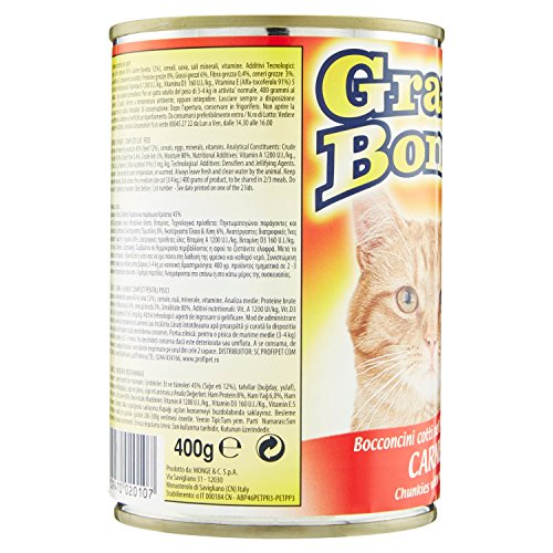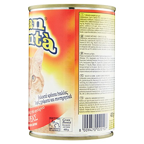 Dettagli: Descrizione prodotto Bocconcini, Cotti nel Forno con Carne24 pezzi da 400 g [9600 g] Marca: Gran Bonta' Tipo di Prodotto: MEAT Indicazioni Tutte le età, Taglia piccola, Carne Indicazioni Bocconcini, Cotti nel Forno con Carne. Servire una porzione di 9600 grammi.