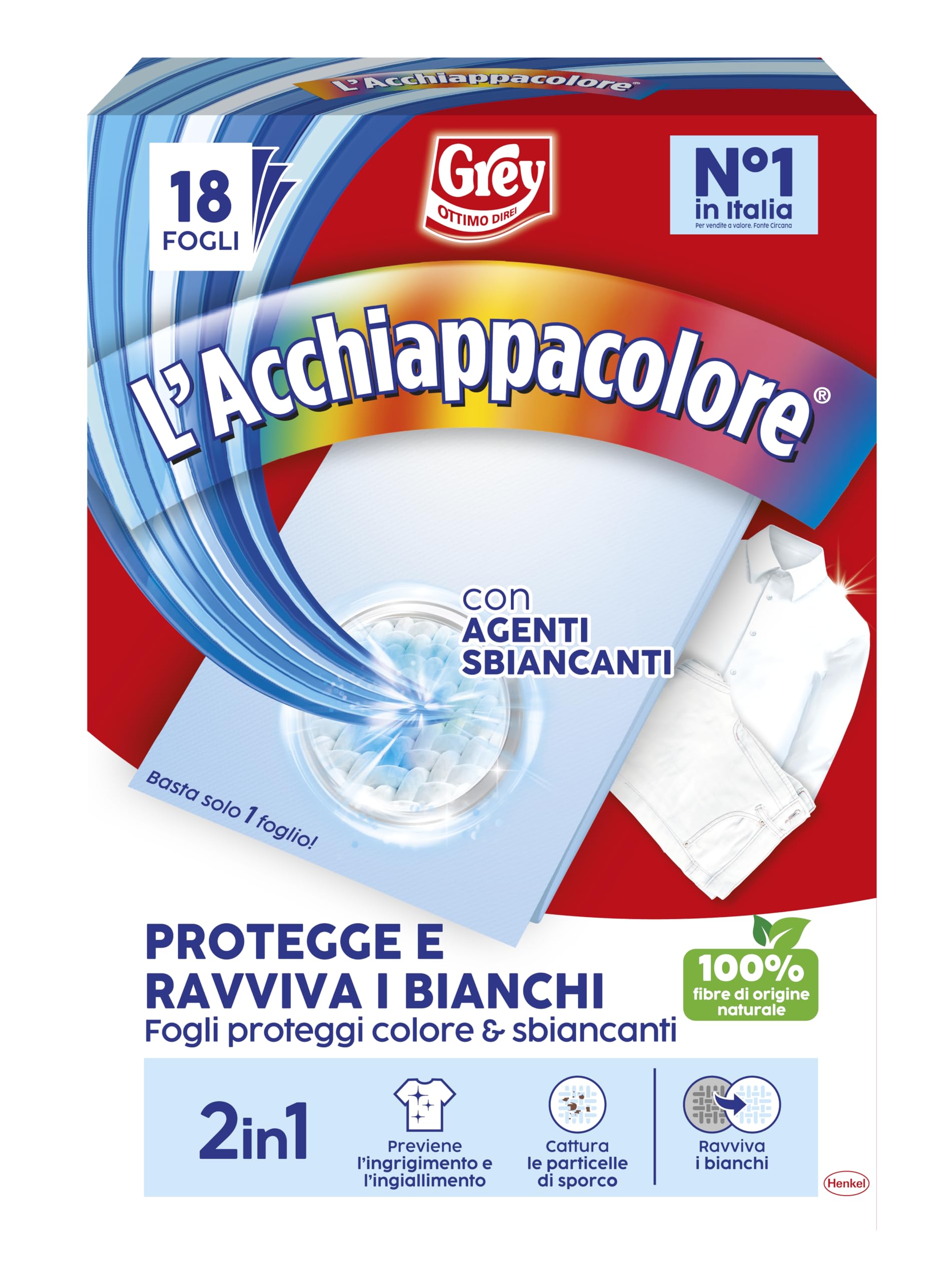 - Grey L'Acchiappacolore 2in1 Protegge e Ravviva i bianchi protegge gli indumenti bianchi e ne previene l'ingrigimento e l'ingiallimento