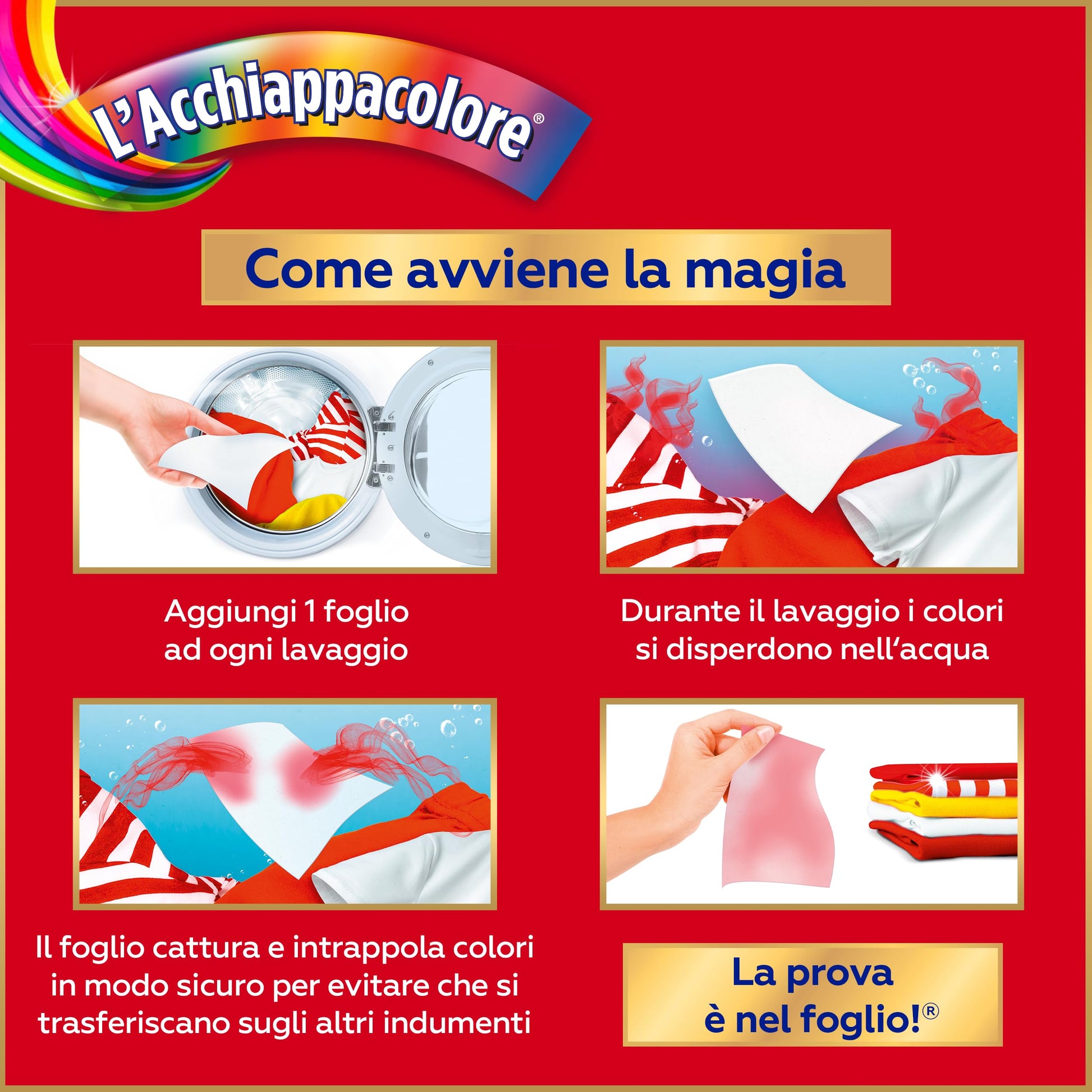 - Soluzione proteggi bucato: fogli L'Acchiappacolore creati per proteggere i capi dagli incidenti di lavaggio e preservare la brillantezza dei colori; ottimi risultati per tutto il bucato, indipendentemente dal tessuto, ciclo di lavaggio o temperatura