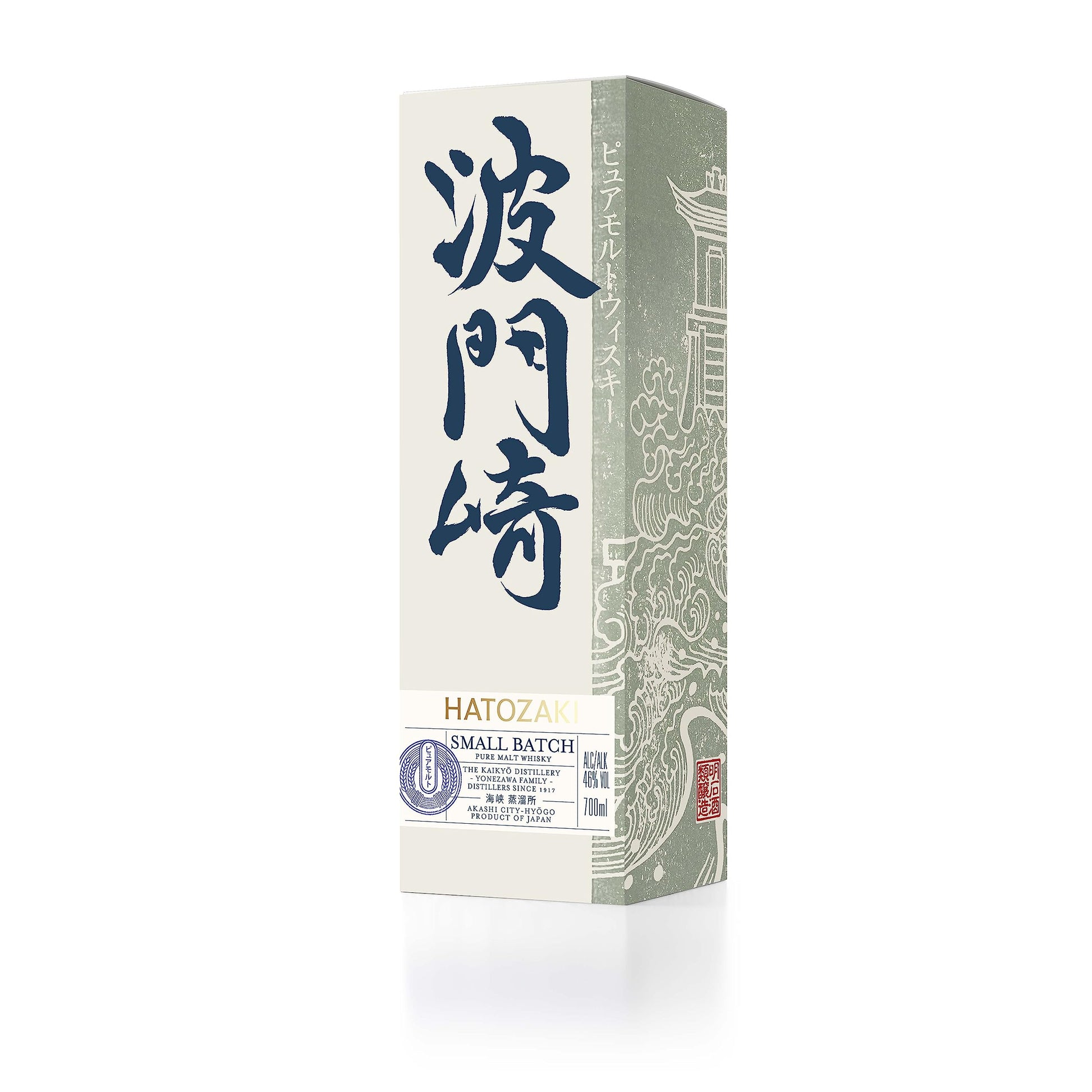 Dettagli: Gli Hatozaki Whiskies sono prodotti nella Distilleria Kaikyo, che deve il suo nome al famoso ponte AkashiKaikyo. La famiglia Yonezawa produce sake nel proprio birrificio Akashi-Tai dal 1856 e nel 1917 ha iniziato a distillare altri distillati. Hatozaki PURE MALT è una miscela di whisky al 100% di malto, invecchiato in botti di rovere ex Bourbon, ex-Sherry e Mizunara.