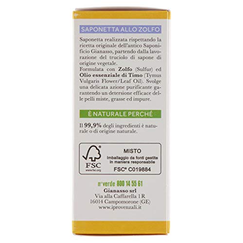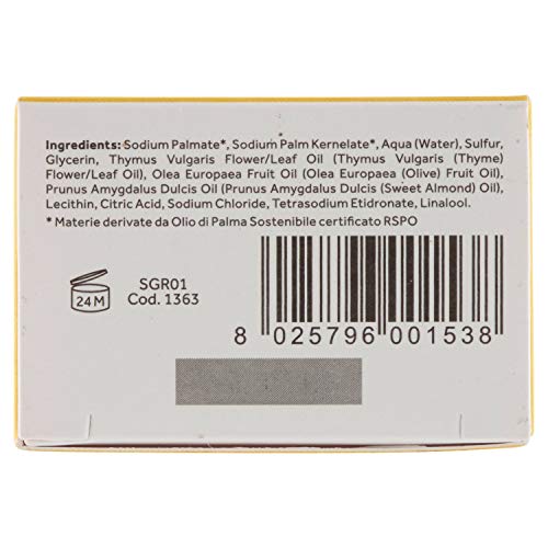 Dettagli: Descrizione Ottimo prodotto Ingredienti Sodium Palmate, Sodium Cocoate, Aqua, Sulfur, Glycerin, Lecithin, Olea Europea Oil, Prunus Amygdalus Dulcis Oil, Citric Acid, Thymus Vulgaris Oil, Tetrasodium Etidronate.