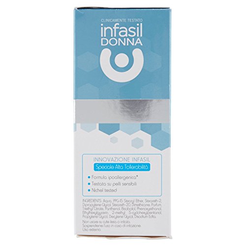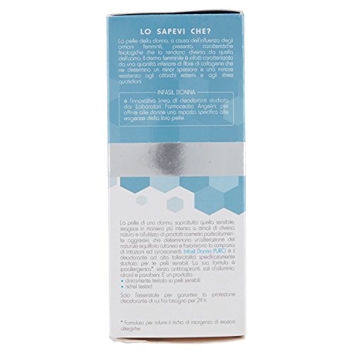 Dettagli: La pelle della donna, a causa dell'influenza degli ormoni femminili, presenta caratteristiche fisiologiche che la rendono diversa da quella dell'uomo. Il derma femminile è infatti caratterizzato da una quantità inferiore di fibre di collagene che ne determina un minore spessore e una minore resistenza agli attacchi esterni e agli stress quotidiani. INFASIL DONNA è l'innovativa linea di deodoranti studiata dai LABORATORI FARMACEUTICI ANGELINI per offrire alle donne una risposta specifica alle esigenze della loro pelle. La pelle di una donna, soprattutto quella sensibile, reagisce in maniera più intensa a stimoli di diversa natura e all'utilizzo di prodotti cosmetici particolarmente aggressivi, che determinano un'alterazione del naturale equilibrio cutaneo e favoriscono la comparsa di irritazioni ed arrossamenti. INFASIL DONNA PURO è il deodorante ad alta tollerabilità specificamente studiato per le pelli sensibili. La sua formula è ipoallergenica*, senza antitraspiranti, sali d'alluminio, alcool e parabeni. È un prodotto: - clinicamente testato su pelli sensibili - nichel tested Solo l'essenziale per garantire la protezione deodorante di cui hai bisogno per 24h. *FORMULATO PER RIDURRE IL RISCHIO DI INSORGENZA DI REAZIONI ALLERGICHE