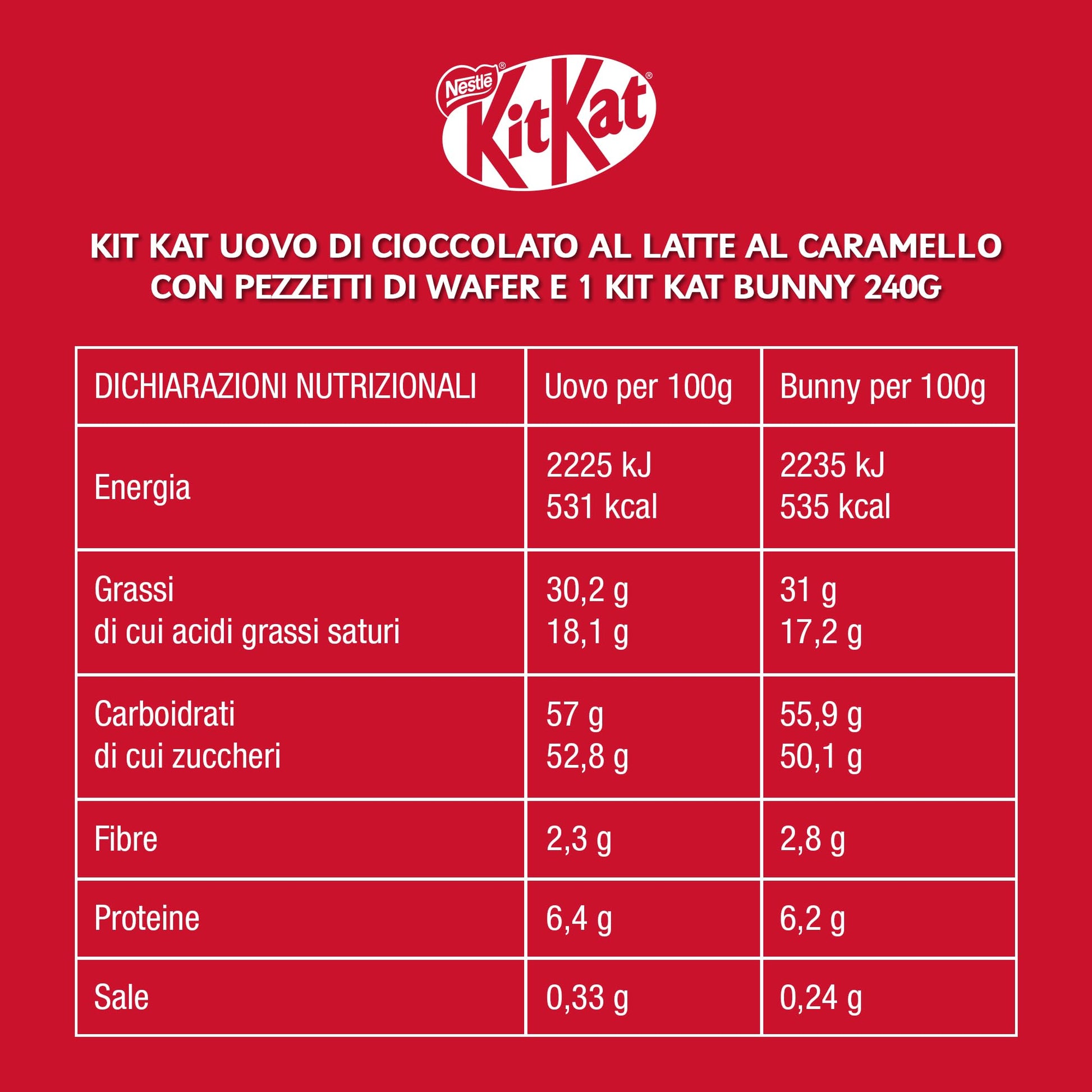 Dettagli: Descrizione Scopri il nuovo uovo di Pasqua KITKAT: un delizioso guscio di cioccolato al latte al gusto di Caramello con croccanti pezzetti di wafer nel guscio, per un Easter Break sensazionale! All'interno una doppia sorpresa per tutti: un goloso KITKAT BUNNY di cioccolato al latte ripieno e un codice per redimere una settimana di prova gratuita di PlayStation Plus Premium. In più partecipa al concorso: all'interno di 10 uova fortunate potrai trovare un biglietto con Astro Bot Gold che ti consentirà di vincere una console PlayStation 5 e il gioco dell'anno PlayStation Astro Bot! Concorso valido dal 01/02/2025 al 31/05/2025. Scopri di più sul sito KITKAT. A Pasqua regala l'uovo KITKAT! Ingredienti UOVO: Ingredienti: zucchero, burro di cacao*, LATTE in polvere, pasta di cacao*, wafer sbriciolato 6% (farina di riso, zucchero, amido di mais, olio di palma, farina di mais, emulsionante (lecitine), sale), siero di LATTE in polvere, BURRO anidro, emulsionante (lecitine), aroma naturale, aroma naturale di vaniglia. Cacao: 32% minimo nel cioccolato al latte. PUÒ CONTENERE FRUTTA A GUSCIO. SENZA GLUTINE. KitKat Bunny: Ingredienti: zucchero, oli vegetali (palma, colza in proporzione variabile), LATTE scremato in polvere, burro di cacao*, pasta di cacao*, LATTOSIO, cereali croccanti 3,6% [farina di riso, zucchero, proteine del siero di LATTE concentrate, agente lievitante (carbonati di sodio), sale, aroma naturale di vaniglia], cacao magro in polvere* 3,5%, biscotto in polvere 2,7% [farina di riso, amido di patata, zucchero, olio di palma, agente lievitante (carbonati di sodio), sale, aroma naturale], siero di LATTE in polvere, BURRO anidro, wafer sbriciolato 0,8% [farina di riso, zucchero, amido di mais, olio di palma, farina di mais, emulsionante (lecitine), sale], emulsionante (lecitine). PUÒ CONTENERE FRUTTA A GUSCIO. SENZA GLUTINE. *Certificato Rainforest Alliance.
