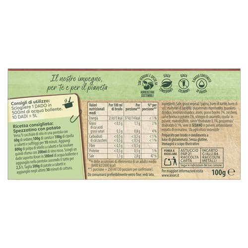Dettagli: Descrizione Da sempre Knorr produce i suoi dadi con cura, utilizzando solo ingredienti di qualità e scelti attentamente per ottenere sempre un brodo dal gusto inconfondibile. Ingredienti Ingredienti: Sale da cucina, grasso di palma, esaltatori di sapidità: glutammato monosodico, guanilato disodico, inosinato disodico, estratto di carne 2,2%, zucchero, zucchero caramellato, spezie (cipolla disidratata, semi di SEDANO in polvere), carote disidratate, prezzemolo disidratato, aromi. Indicazioni COME SI USA#Per il brodo - Aggiungi un dado in 500 ml d'acqua e porta a bollore.|Per insaporire - Aggiungi un dado alle tue ricette per esaltarne il sapore. - Buon Appetito!