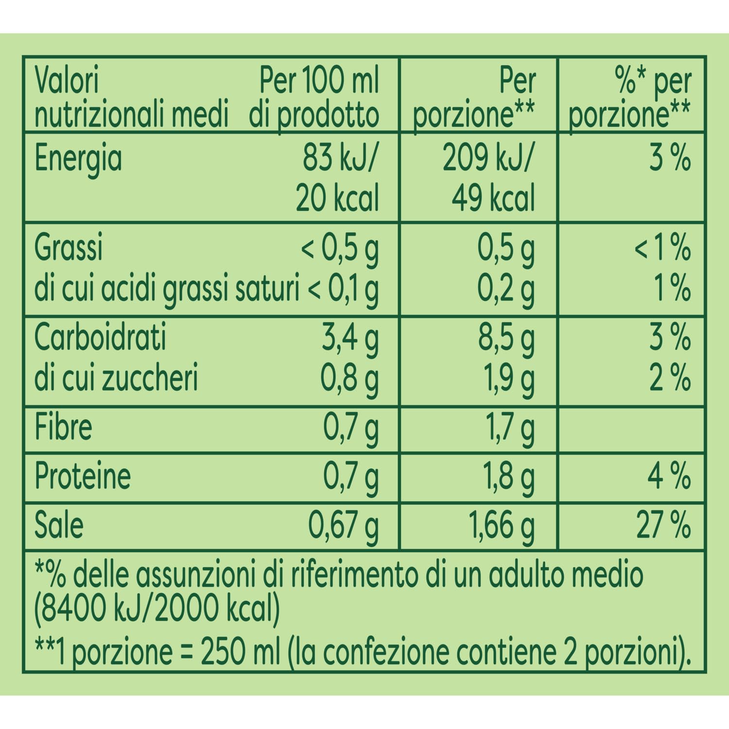 - RICCA DI VERDURE: una porzione contribuisce per il 17% alla razione giornaliera di frutta e verdura (400g) consigliata dalla Organizzazione Mondiale della Sanità per una dieta sana ed equilibrata