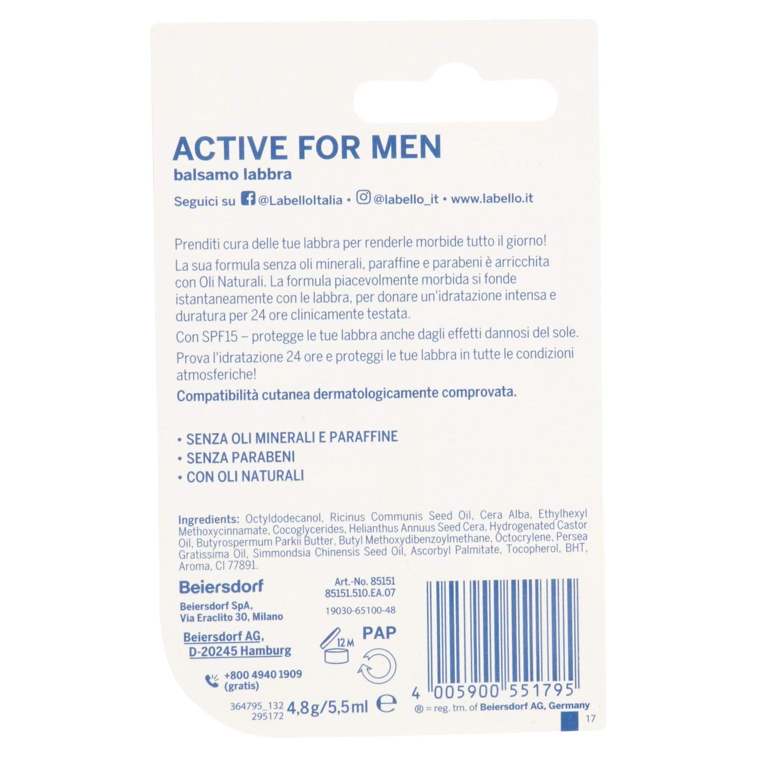 Dettagli: Labello Active for Men Formula senza Oli Minerali e Parabeni, 24h di idratazione, Fattore di protezione solare 15.