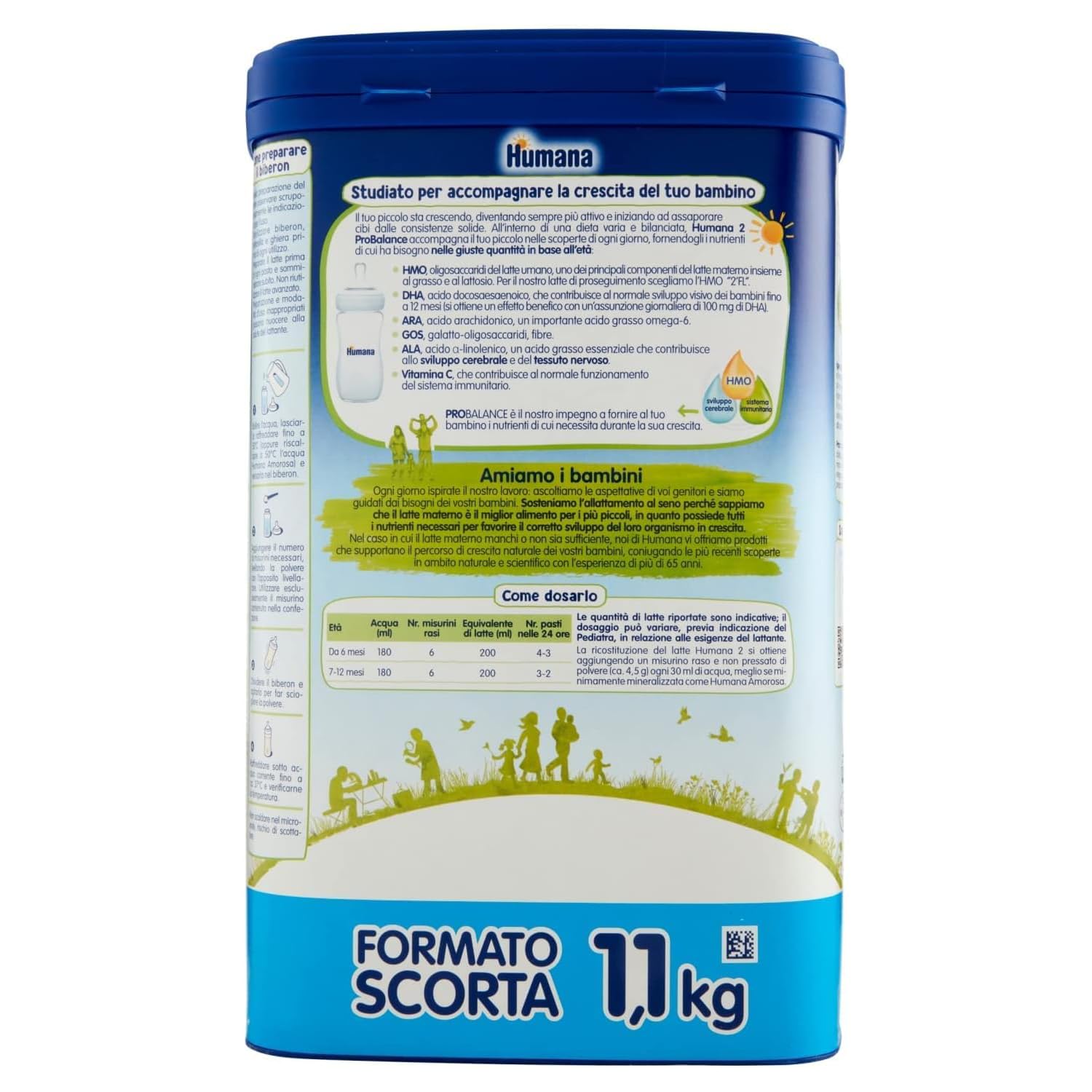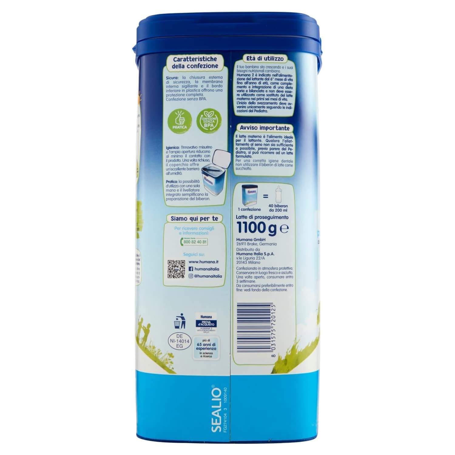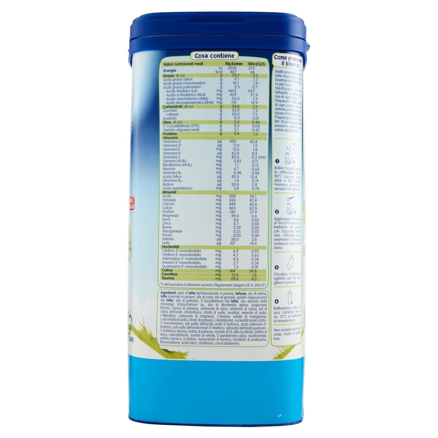 Dettagli: Descrizione Descrizione prodotto LATTE HUMANA 2 POLVERE GR. 1100 Ingredienti Siero di latte demineralizzato in polvere, Oli vegetali (palma, colza e girasole), Lattosio, Latte scremato in polvere, Galatto-oligosaccaridi (da latte), Olio di palmisto, Cloruro di potassio, Sali di calcio dell'acido ortofosforico, Citrato di sodio, Carbonato di calcio, Olio da microalghe Schizochytrium sp., 2'-fucosillattosio (da latte), Bitartrato di colina, Olio da Mortierella alpina, Carbonato di magnesio, L-tirosina, L-ascorbato di sodio, Inositolo, L-fenilalanina, L-triptofano, Citrato di potassio, Taurina, Nucleotidi (acido citidin-5'-monofosforico, sali sodici dell'acido uridin-5'-fosforico, acido adenosin-5'-fosforico, sali sodici dell'acido inosin-5'-fosforico, sali sodici dell'acido guanosin-5'-fosforico), Bisglicinato ferroso, Solfato di zinco, Acetato di DL-alfa-tocoferile, Calcio D-pantotenato, Nicotinamide, Cloridrato di tiamina, Solfato rameico, Solfato di manganese, Cloridrato di piridossina, Acetato di retinile, Colecalciferolo, Riboflavina, Ioduro di potassio, Acido folico, Fitomenadione, Selenato di sodio, D-biotina, Cianocobalamina Ingredienti Siero di latte demineralizzato in polvere, Oli vegetali (palma, colza e girasole), Lattosio, Latte scremato in polvere, Galatto-oligosaccaridi (da latte), Olio di palmisto, Cloruro di potassio, Sali di calcio dell'acido ortofosforico, Citrato di sodio, Carbonato di calcio, Olio da microalghe Schizochytrium sp., 2'-fucosillattosio (da latte), Bitartrato di colina, Olio da Mortierella alpina, Carbonato di magnesio, L-tirosina, L-ascorbato di sodio, Inositolo, L-fenilalanina, L-triptofano, Citrato di potassio, Taurina, Nucleotidi (acido citidin-5'-monofosforico, sali sodici dell'acido uridin-5'-fosforico, acido adenosin-5'-fosforico, sali sodici dell'acido inosin-5'-fosforico, sali sodici dell'acido guanosin-5'-fosforico), Bisglicinato ferroso, Solfato di zinco, Acetato di DL-alfa-tocoferile, Calcio D-pantotenato, Nicotinamide, Cloridrato di tiamina, Solfato rameico, Solfato di manganese, Cloridrato di piridossina, Acetato di retinile, Colecalciferolo, Riboflavina, Ioduro di potassio, Acido folico, Fitomenadione, Selenato di sodio, D-biotina, Cianocobalamina Avviso di sicurezza Solo per uso esterno. Evitare il contatto con gli occhi. Tenere lontano dalla fiamma nuda diretta o da fonti di calore.
