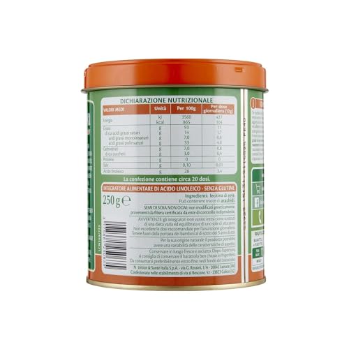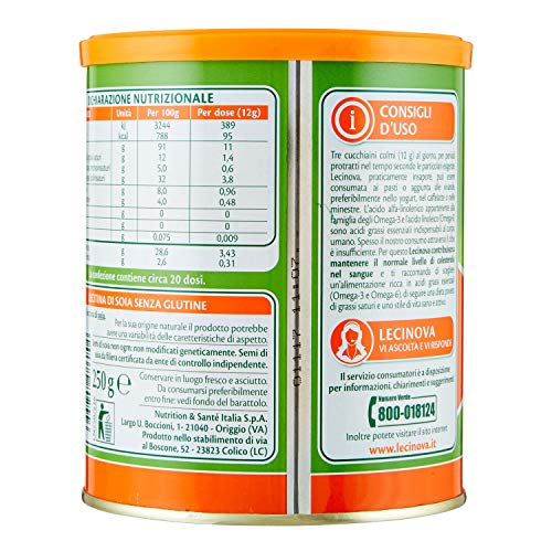 Dettagli: Descrizione La lecitina di soia Lecinova, ricavata da soia non OGM, favorisce il tuo benessere fisico. La lecitina di soia Lecinova contiene acido linoleico, cioè Omega 6, un grasso fondamentale per il benessere dell'organismo. Questa lecitina è senza glutine, quindi è indicata per i celiaci e per chi segue una dieta gluten free, e non ha controindicazioni. Una porzione sono tre cucchiai colmi, cioè 12 gr, da aggiungere a minestre, insalate, yogurt, caffelatte e qualsiasi altra preparazione. Ingredienti Lecitina di SOIA. Indicazioni Conservare in luogo fresco e asciutto. Dopo l'apertura, si consiglia di conservare il barattolo ben chiuso in frigorifero.