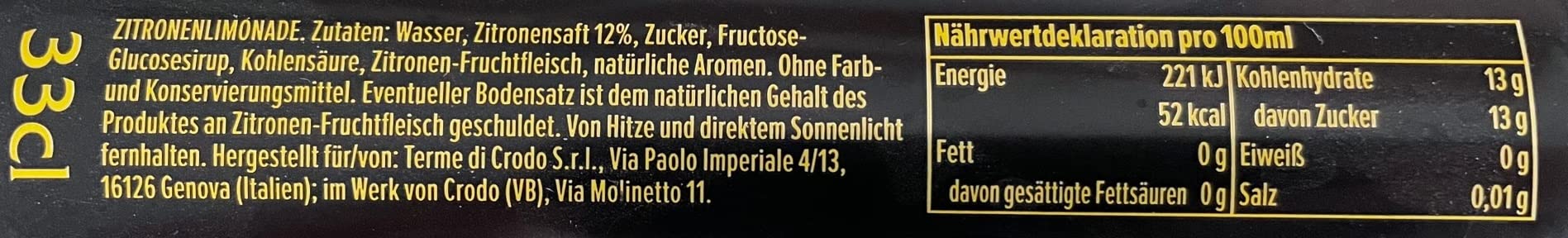 Dettagli: Descrizione prodotto Ingredienti: acqua minerale, succo di limone 12%, zucchero, sciroppo di glucosio fruttosio, anidride carbonica, polpa di limone, aromi naturali. Dichiarazione dei valori nutrizionali per 100 ml: energia: 221 kJ / 52 kcal, grassi: 0 g, di cui acidi grassi saturi: 0 g, carboidrati: 13 g, di cui zuccheri: 13 g, proteine: 0 g, proteine: 0 g. Sale: 0,0 1 g. Ingredienti: acqua, succo di limone 12%, zucchero, sciroppo di glucosio di fruttosio, anidride carbonica, depurazione di frutta di limone, aromi naturali. Senza coloranti e conservanti. Distributore: Cioccolato Ring Bevande e Dolcetti eG, Ketzelstraße 7, 90419 Norimberga Indicazioni Consumare come bevanda rinfrescante Avviso di sicurezza Conservare in un luogo fresco e asciutto, lontano dalla luce solare diretta e da temperature estreme