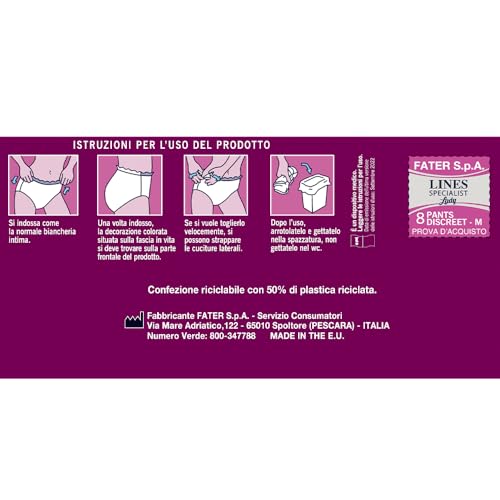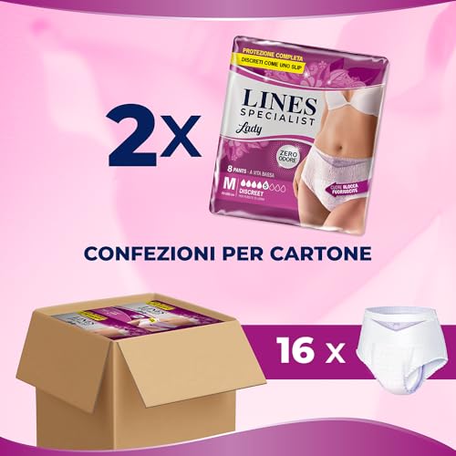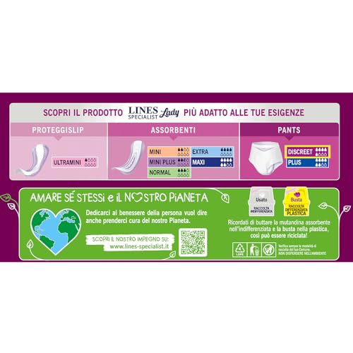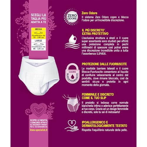 Dettagli: Descrizione Le mutandine assorbenti Lines Specialist Pants Lady si indossano come normale biancheria intima e aderiscono perfettamente al tuo corpo. Grazie ad un design femminile e discreto, solo tu sai di indossarle! Inoltre, la struttura a strati e il cuore super assorbente sono studiati per offrirti una protezione completa in pochi millimetri di spessore così potrai avere una discrezione indescrivibile unita a tutta l'assorbenza LINES. Le morbide barriere laterali e il cuore Blocca-Fuoriuscite consentono al liquido di confluire velocemente al centro del prodotto, dove rimane bloccato, così da farti sentire sicura e protetta in ogni momento della giornata. Presentano anche il sistema Zero Odore*, che blocca e neutralizza l'odore per un'indescrivibile discrezione. Disponibili nella versione Discreet a vita bassa e Plus a vita alta. *Test su prodotto fresco. Indicazioni Applicare come normale biancheria intima, aderendo perfettamente al corpo. Cambia regolarmente. Smaltire igienicamente i protettori usati. Considera la dimensione "grande" quando valuti le tue esigenze.