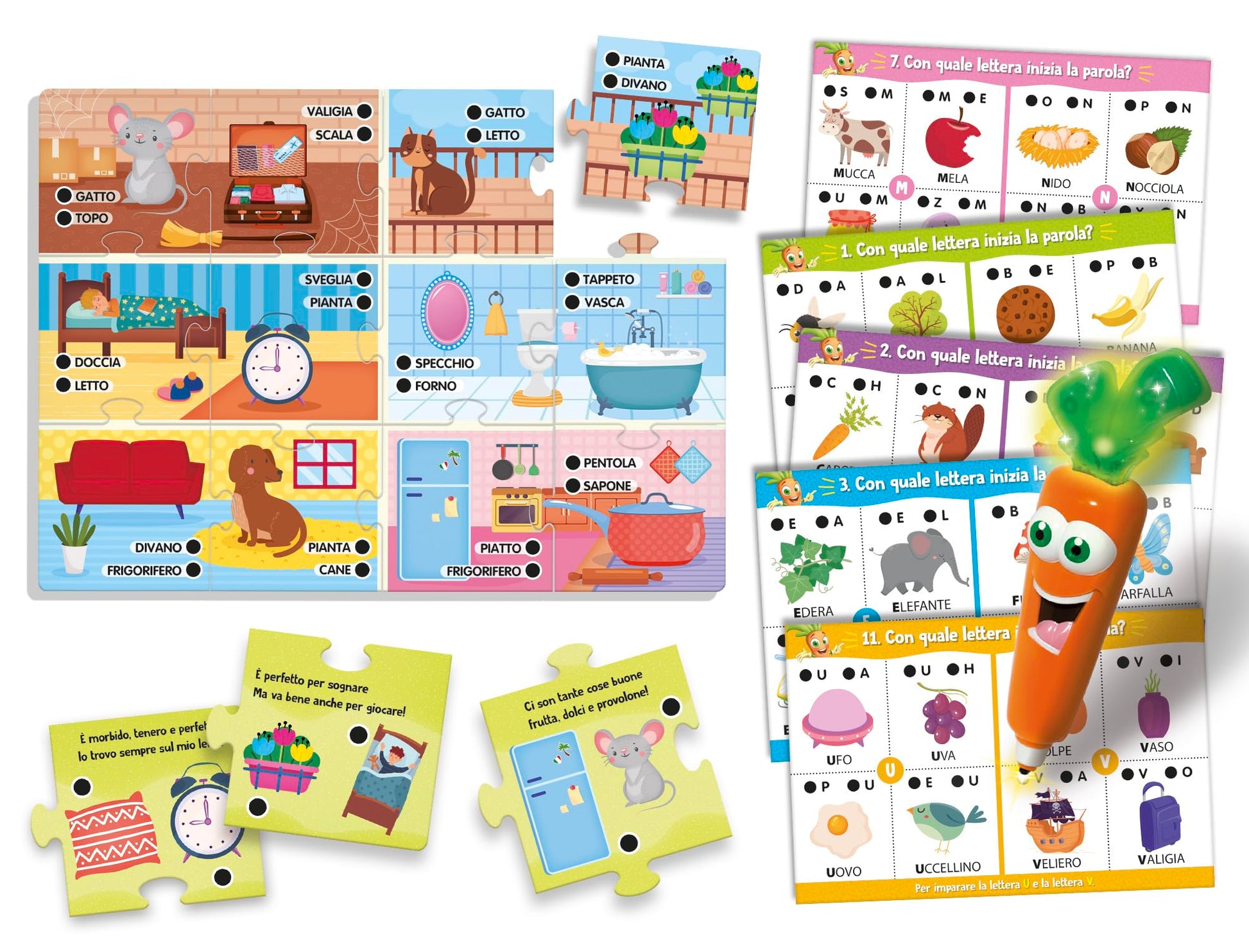Dettagli: Descrizione Un grande alfabetiere interattivo per imparare l'alfabeto e scoprire tante paroline. Tanti quiz educativi per esercitare la logica e arricchire il lessico in compagnia della Carotina parlante e luminosa. Avviso di sicurezza Conforme alle più recenti normative sulla sicurezza. Non adatto ai bambini di età inferiore ai 36 mesi. Leggere le avvertenze sulla confezione.