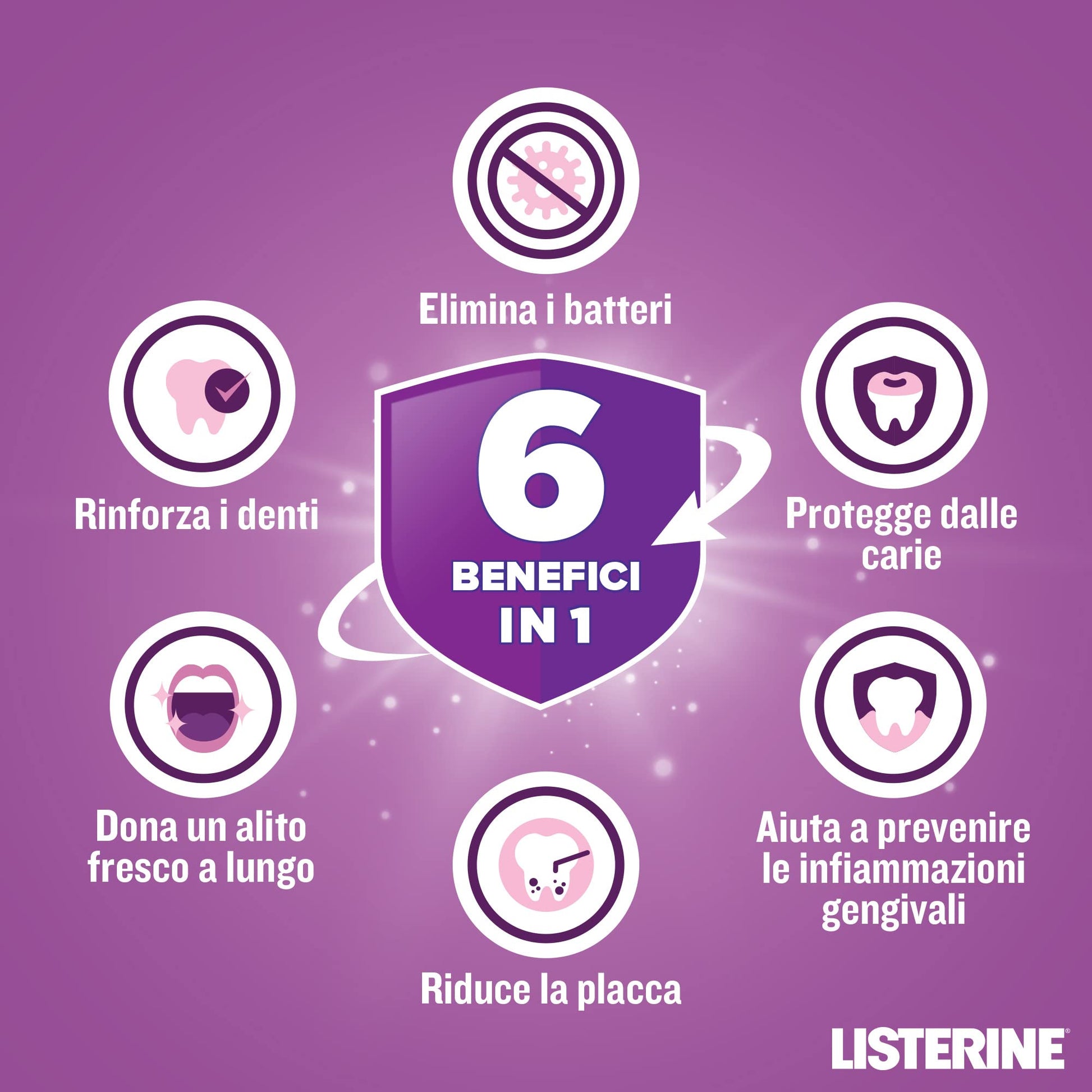 - Combina i quattro oli essenziali di LISTERINE con il cloruro di zinco, 220 ppm di fluoruro e ZERO alcol