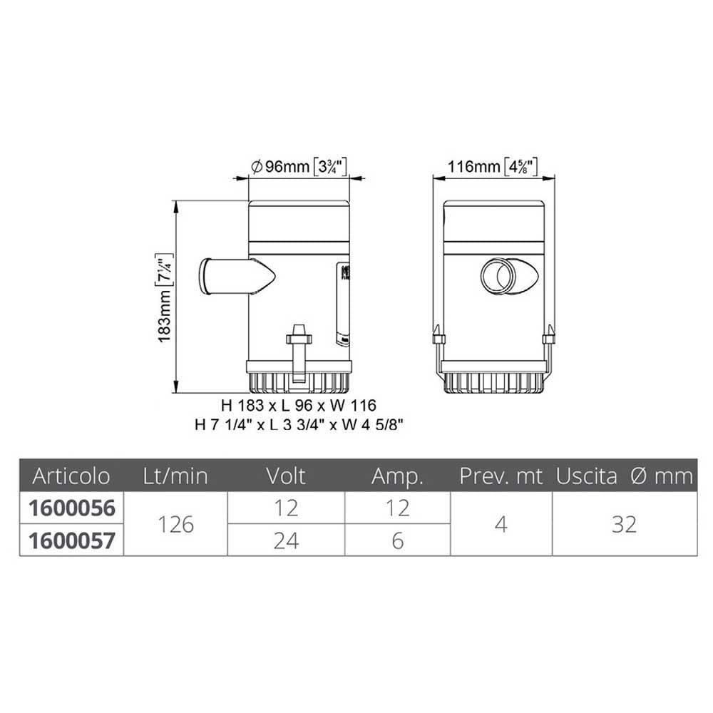 Marco-Pompa Sentina Marco UP 2000 126 Lt/min Modello: 160 160 12 Prevalenza m: 4 Bocca mm: 31,8 mm - 1' 1/4" Portata Lt/min: 126 Lt/min - 2000 gp Consumo Amp.: 12A Dimensioni: 200x96 V: 12