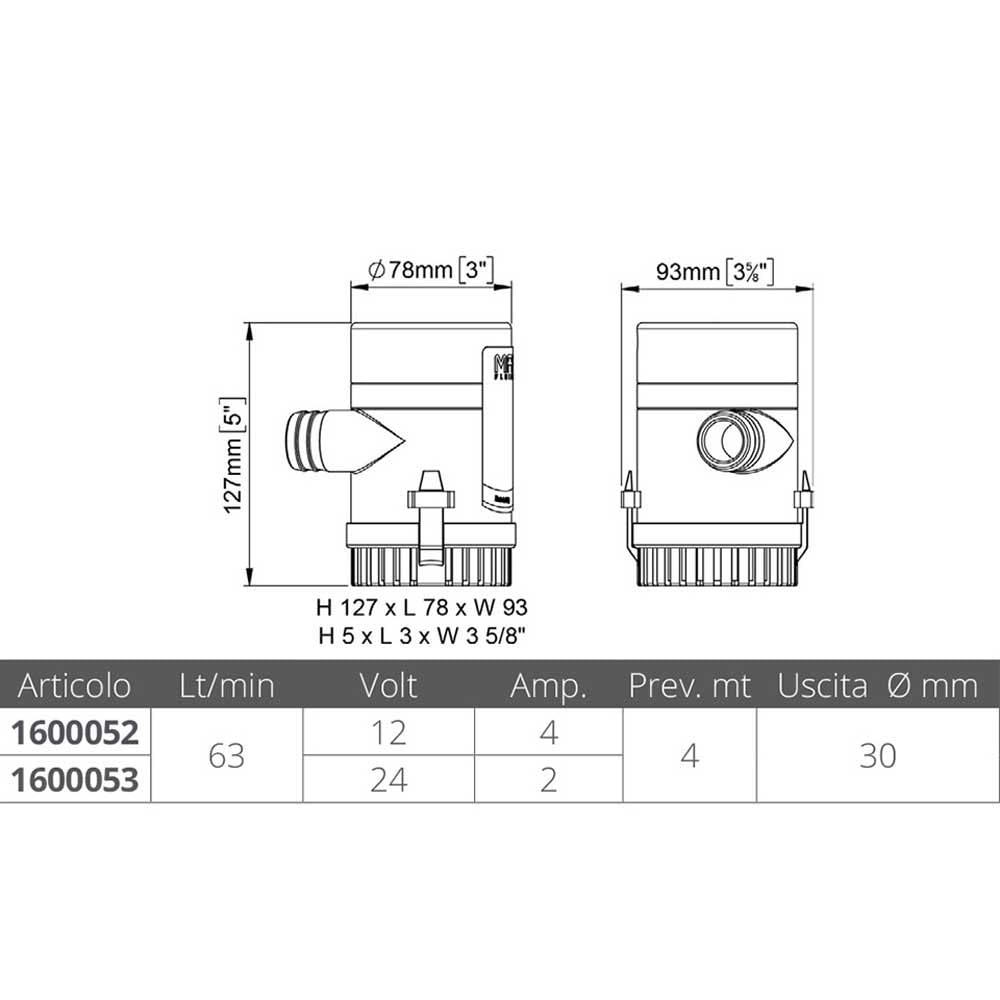 Dettagli: Pompa sommersa per svuotamento sentina. Involucro in robusto ABS antiurto, resistente alla corrosione e all`elettrolisi.