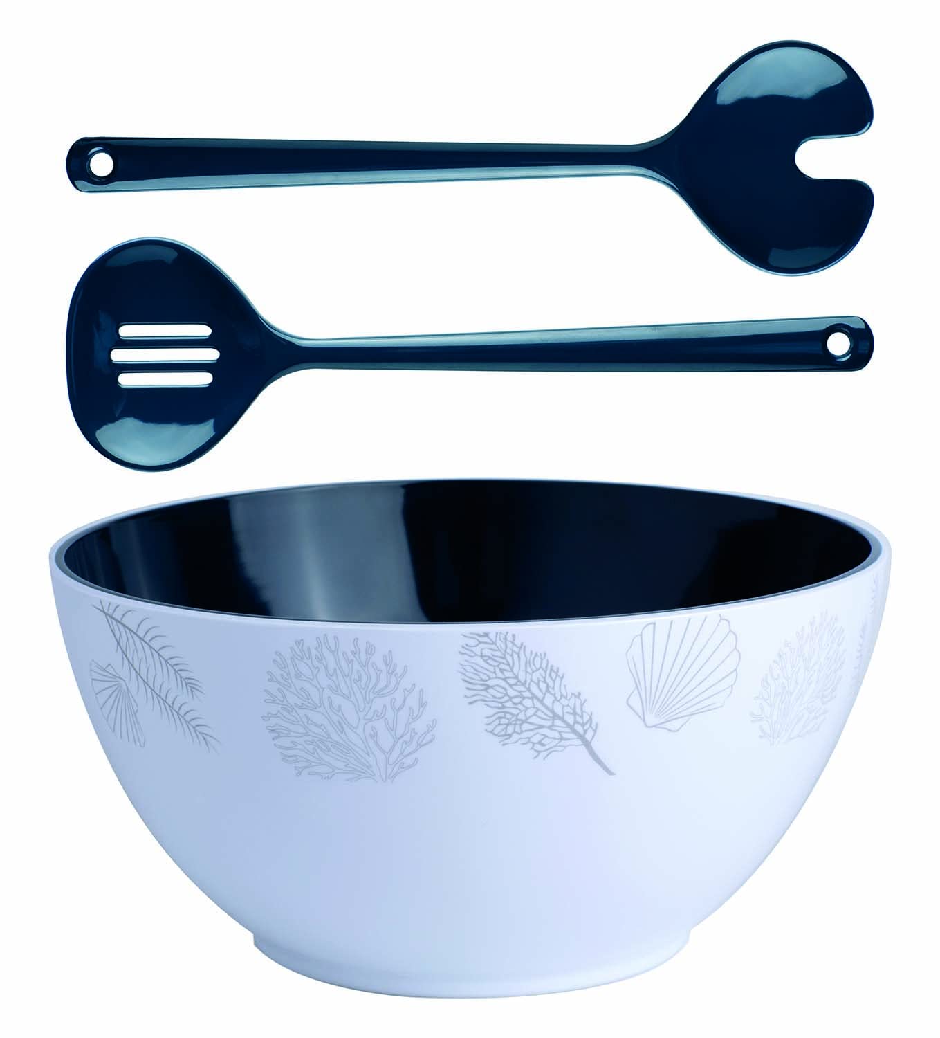 Dettagli: La nuova collezione LIVING è caratterizzata da un leggero disegno di coralli in blu navy e beige, elegante e contemporaneo, perfetto per tutte le occasioni. Le stoviglie, realizzate al 100% in melammina, ed i bicchieri, realizzati in Tritan BPA Free, sono molto resistenti e lavabili in lavastoviglie e presentano una base antiscivolo che ne impedisce lo scivolamento sul tavolo. Insalatiera con coppia di posate per servire, ø25cm – H. 12 cm.