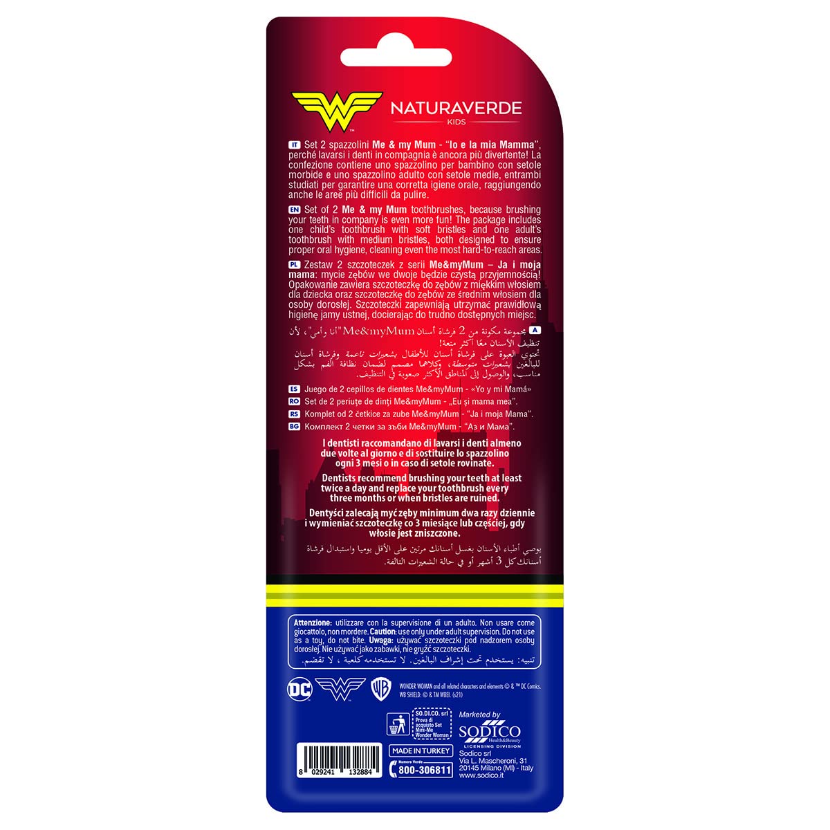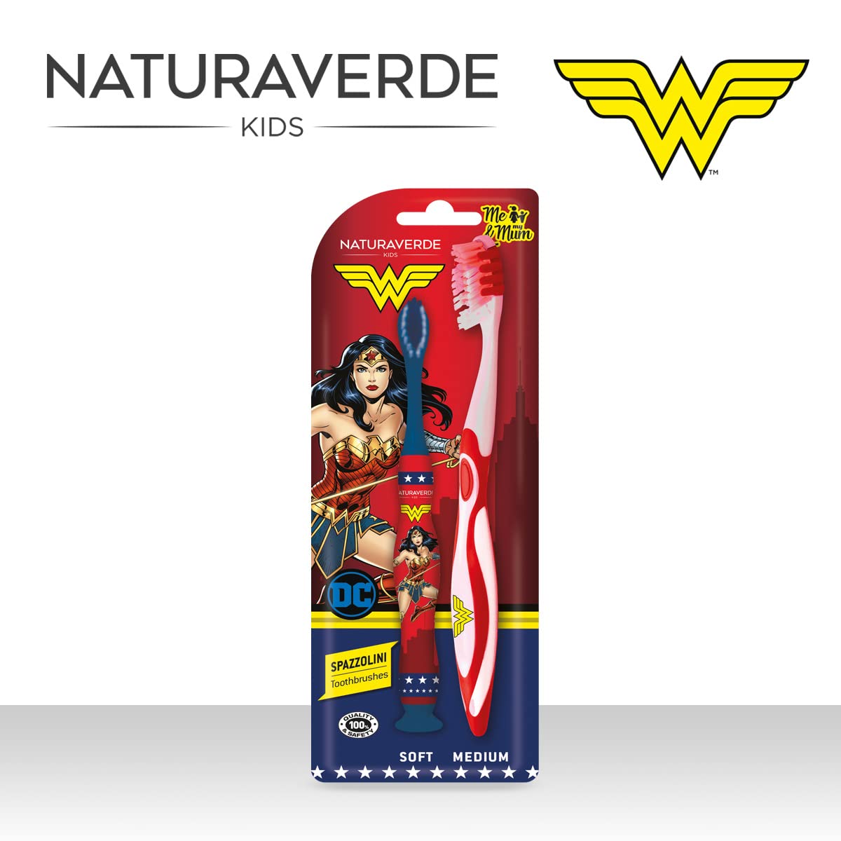 Naturaverde | Kids - Warner Bros Wonder Woman - Set Spazzolini Mini-Me, 1 Spazzolino Adulto e 1 Spazzolino Bambino, Set Spazzolini Denti Divertenti, Spazzolini da Denti Wonder Woman