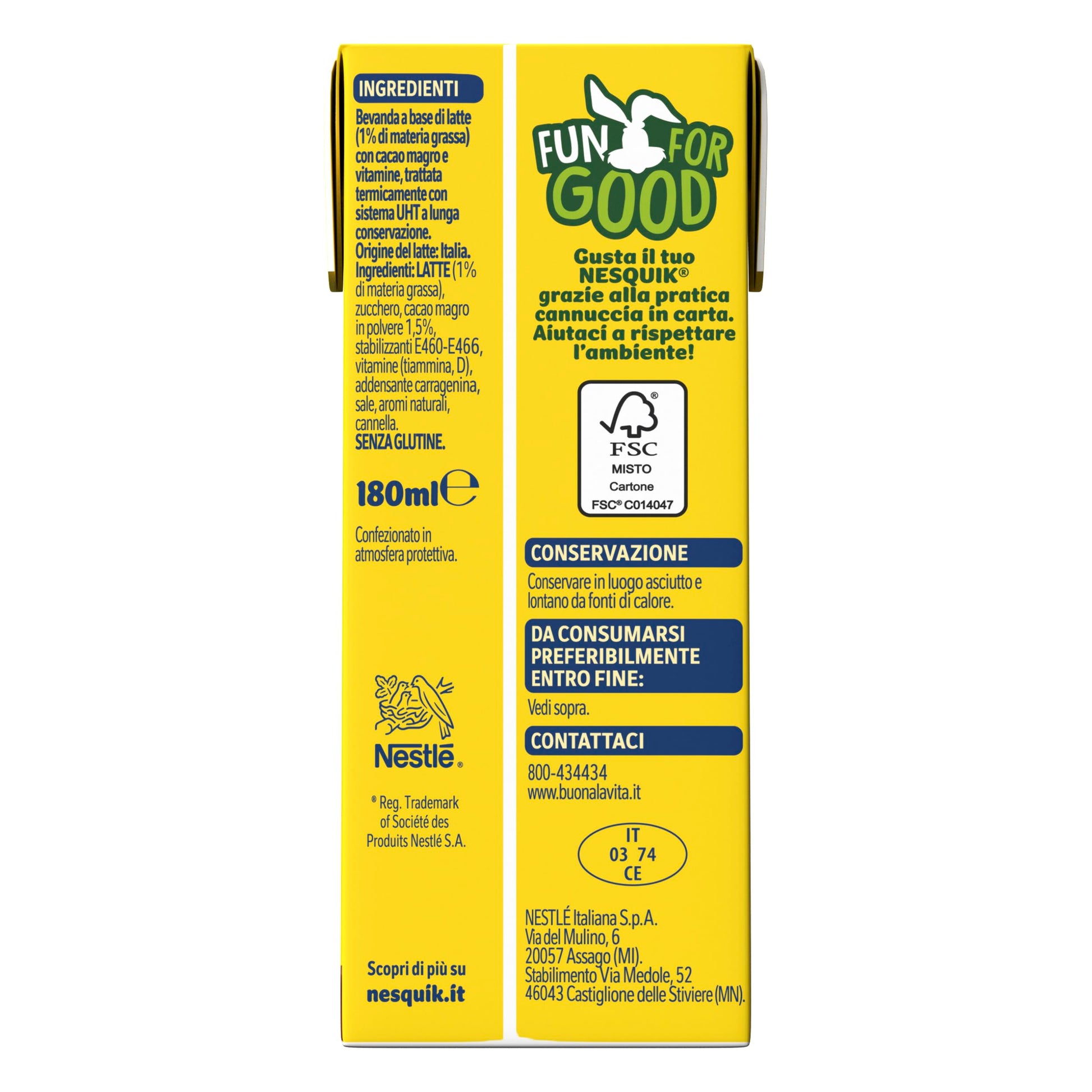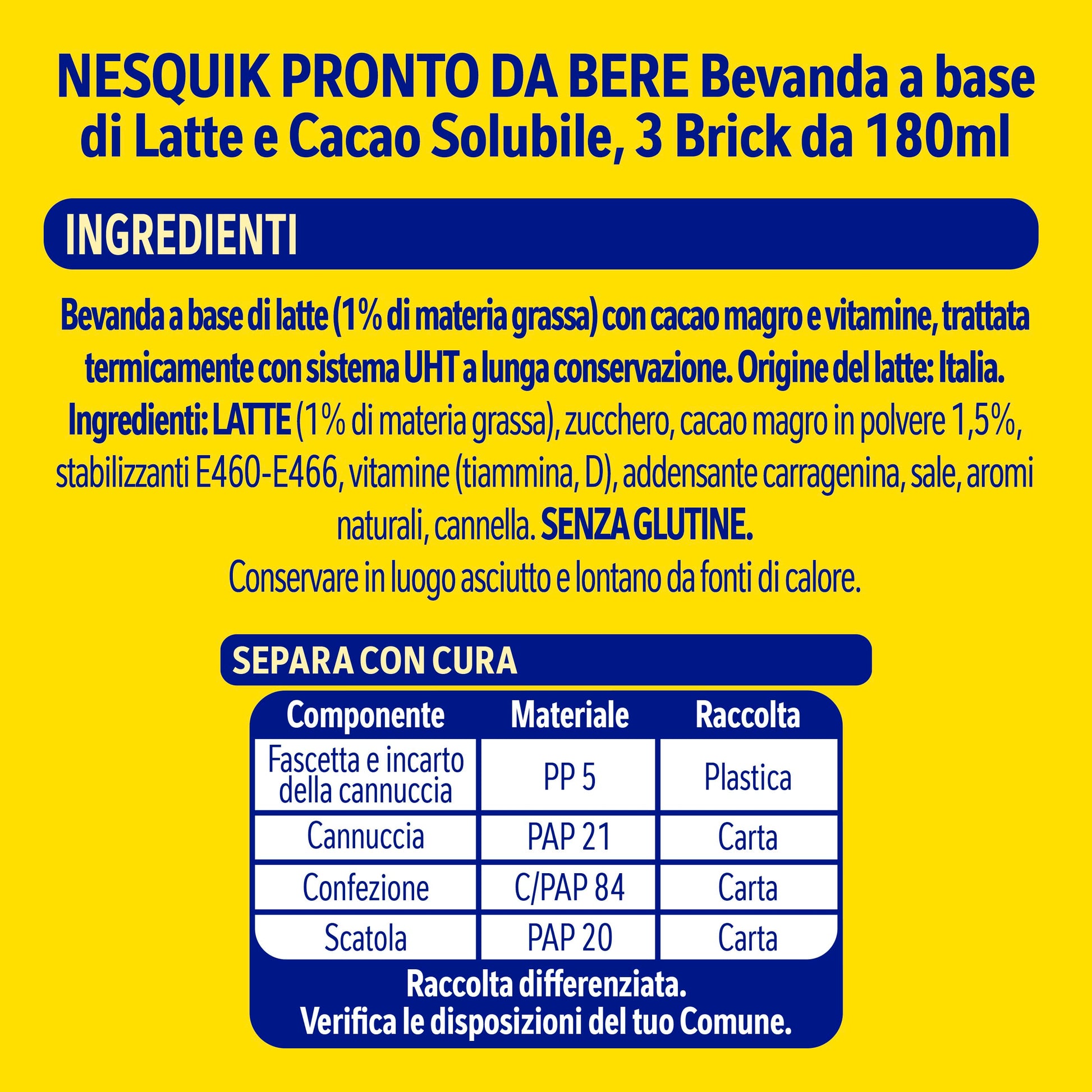 Dettagli: Descrizione NESQUIK Pronto da Bere è una merenda ottima perché unisce tutto il gusto di NESQUIK alla bontà e al nutrimento del latte in una pratica confezione da 180 ml da portare sempre con te. NESQUIK pronto da bere è prodotto con latte 100% italiano e senza glutine. In più devi sapere che è fonte di calcio e vitamina D. Il tuo NESQUIK di sempre in una ottima confezione in brick con la pratica cannuccia in carta. Prova anche NESQUIK Solubile e NESQUIK Biscotti: un gusto unico, ogni volta diverso, per ogni momento della tua giornata. Ingredienti LATTE (1% di materia grassa), zucchero, cacao magro in polvere 1,5%, stabilizzanti E-460, E-466, vitamine (tiamina, D), addensante carragenina, sale, minerali (pirofosfato ferrico, solfato di zinco), aromi, cannella, senza glutine Indicazioni La porzione è costituita da 1 brick da 180 ml