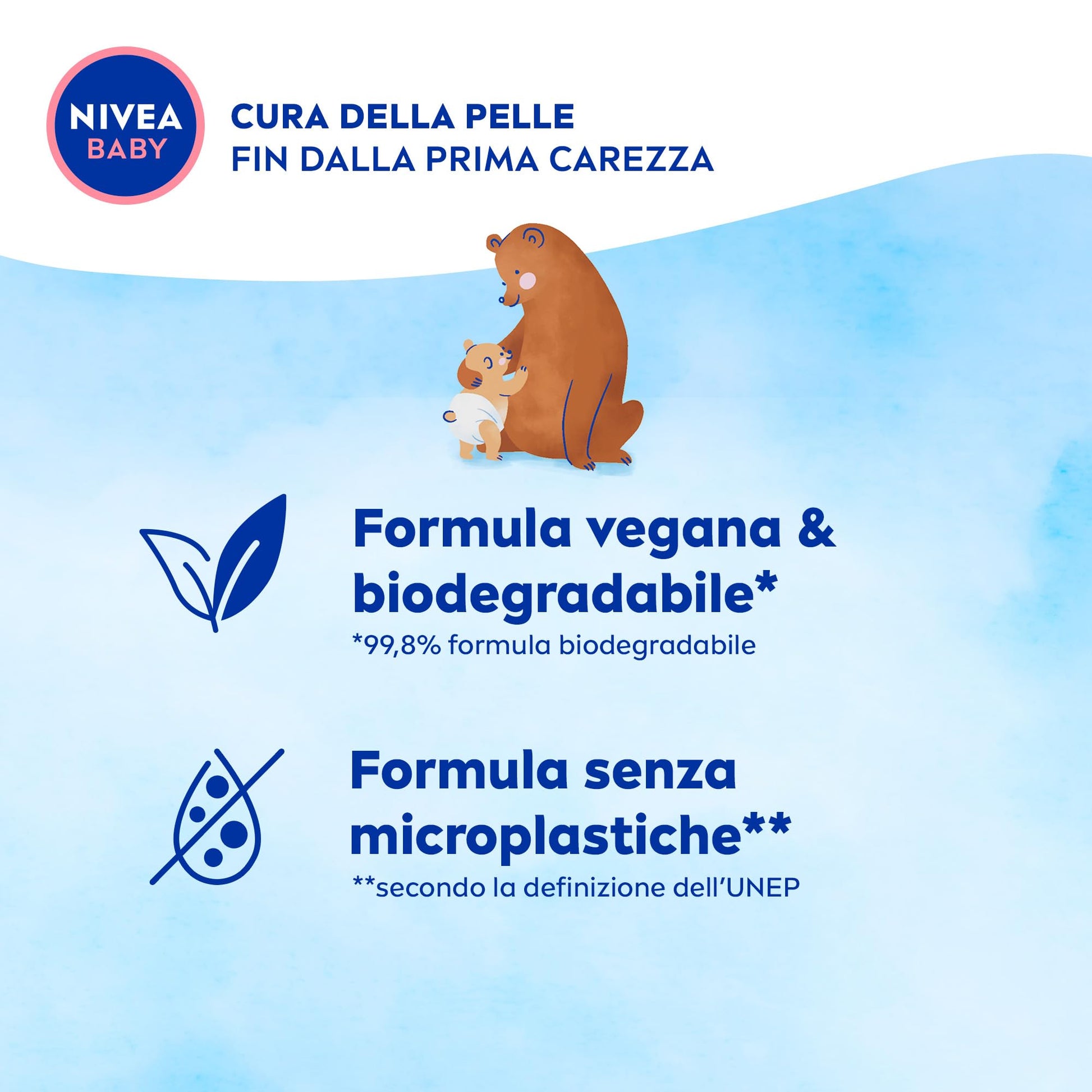 - Cura della pelle e del pianeta – La nuova formula ipoallergenica², vegana e biodegradabile³ della crema bambini non contiene parabeni, solfati, silicone, talco, coloranti e microplastiche⁵