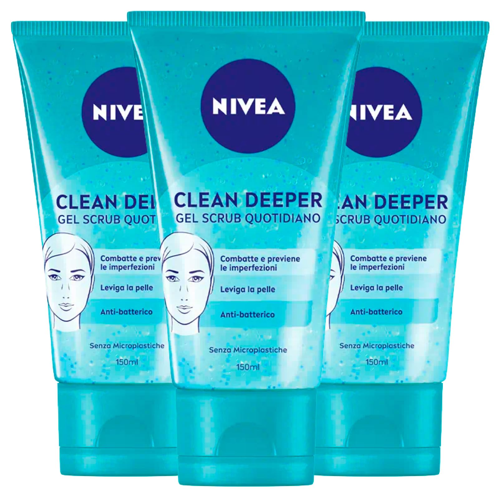 NIVEA Clean Deeper Gel Scrub Quotidiano Esfoliante per Punti Neri Antibatterico con Estratto di Magnolia e Acido Lattico - 3 Flaconi da 150ml