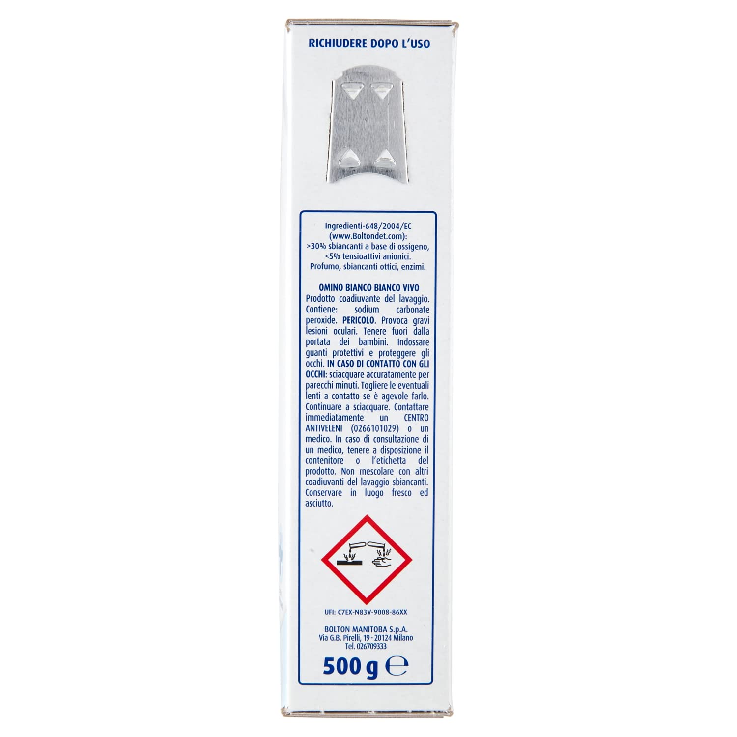 Dettagli: Descrizione prodotto OMINO B.BIANCOVIV.POLV Ingredienti Ingredienti-648/2004/EC (www.Boltondet.com):>30% Sbiancanti a base di ossigeno<5% Tensioattivi anionici Profumo Sbiancanti ottici Enzimi,