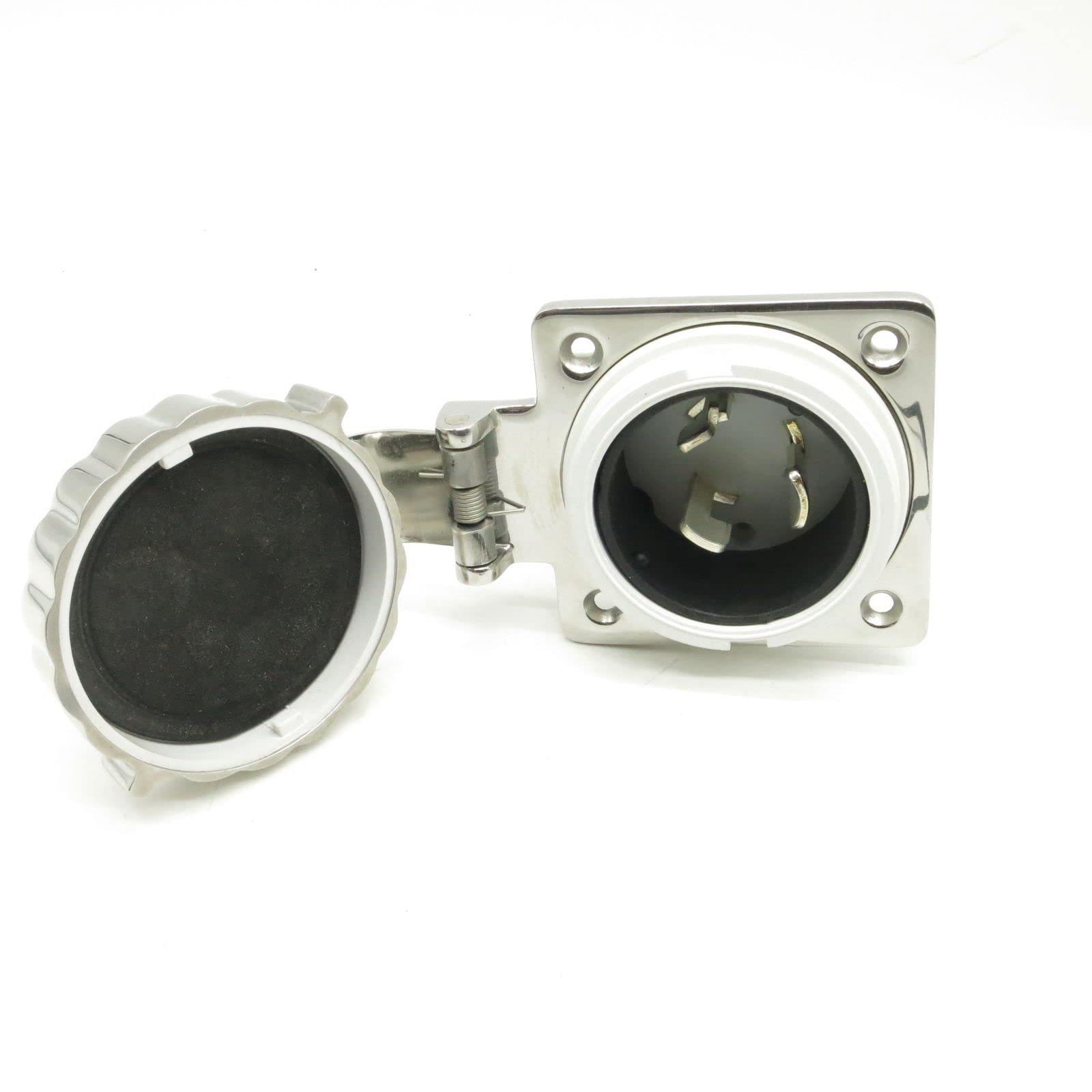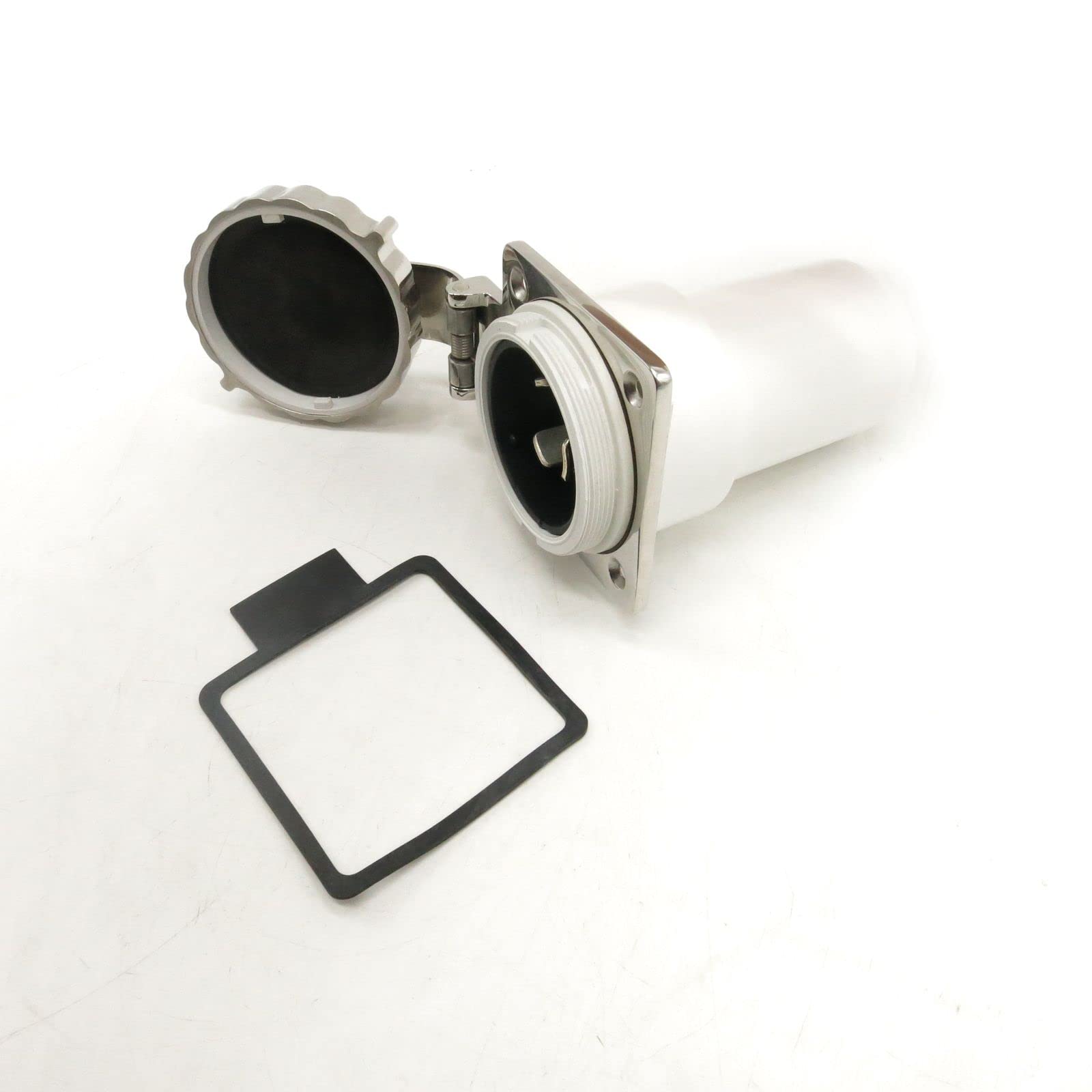 Dettagli: Prese in acciaio inox AISI 316 lucidato a specchio e ottone nichelato in policarbonato e protezione posteriore lato uscita cavi. Tappo policarbonato ottone argentato s. Cappuccio protettivo blu elettrico flessibile in PVC. 220 110 V e 50 A max.