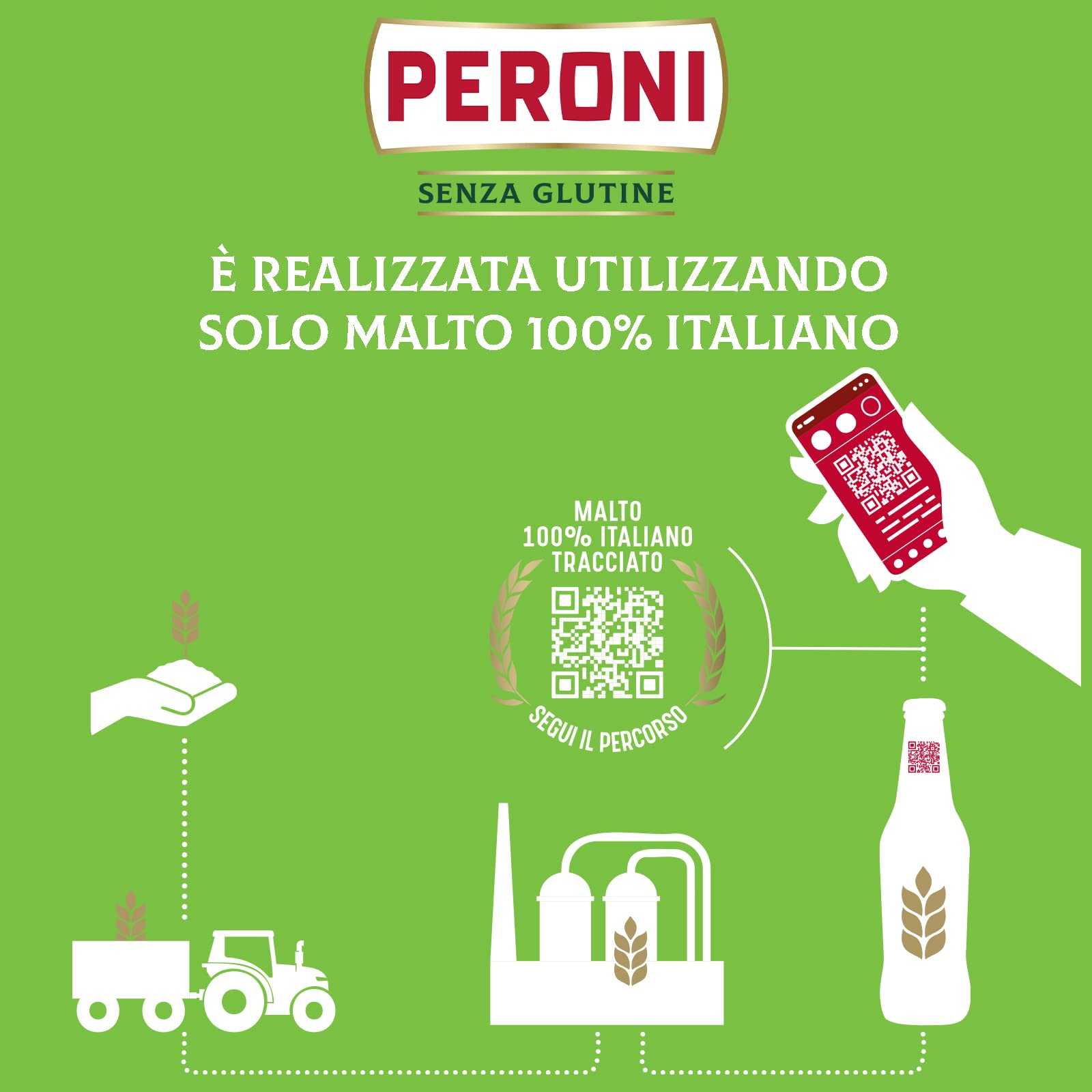 Dettagli: Descrizione Peroni Senza Glutine è la birra italiana senza glutine, garantita dal marchio spiga barrata AIC, Associazione Italiana Celiachia. Ideale per tutti coloro che vogliono godersi una buona birra pur seguendo un’alimentazione senza glutine: è come la Peroni tradizionale, con un perfetto equilibrio tra dolce e amaro. Gli ingredienti vengono selezionati accuratamente e viene analizzato ogni passo del processo produttivo per garantire un contenuto di glutine inferiore a 10 ppm. Peroni Senza Glutine, come tutti i prodotti della Famiglia Peroni, è prodotta con Malto 100% italiano che dal 2021 è tracciato in blockchain per permettere a tutti di scoprire l’origine ed il percorso del malto dentro ogni singola bottiglia. Ingredienti Acqua Malto d'orzo Granturco Luppolo