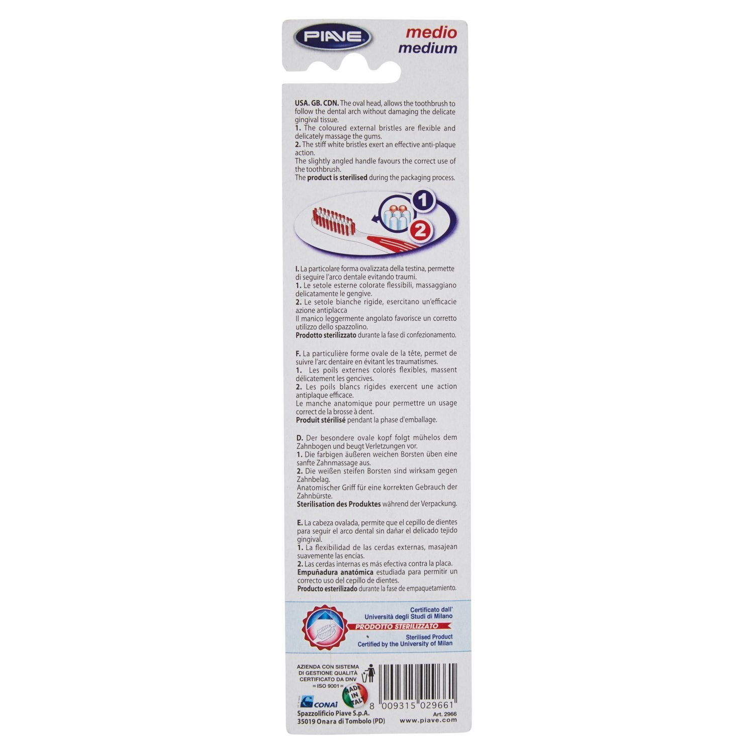 Dettagli: Descrizione prodotto piave spazzolino tynex biattivo medium - massaggio gengivale - azione antiplacca, coprisetole, prodotto sterilizzato, made in italy. la particolare forma ovalizzata della testina, permette di seguire l arco dentale evitando traumi. 1. le setole esterne colorate flessibili, massaggiano delicatamente le gengive. 2. le setole bianche rigide, esercitano un efficacie azione antiplacca il manico leggermente angolato favorisce un corretto utilizzo dello spazzolino Avviso di sicurezza Attenzione: non adatto ai bambini di età inferiore ai 12 anni. Evitare l'ingestione delle testine degli spazzolini.