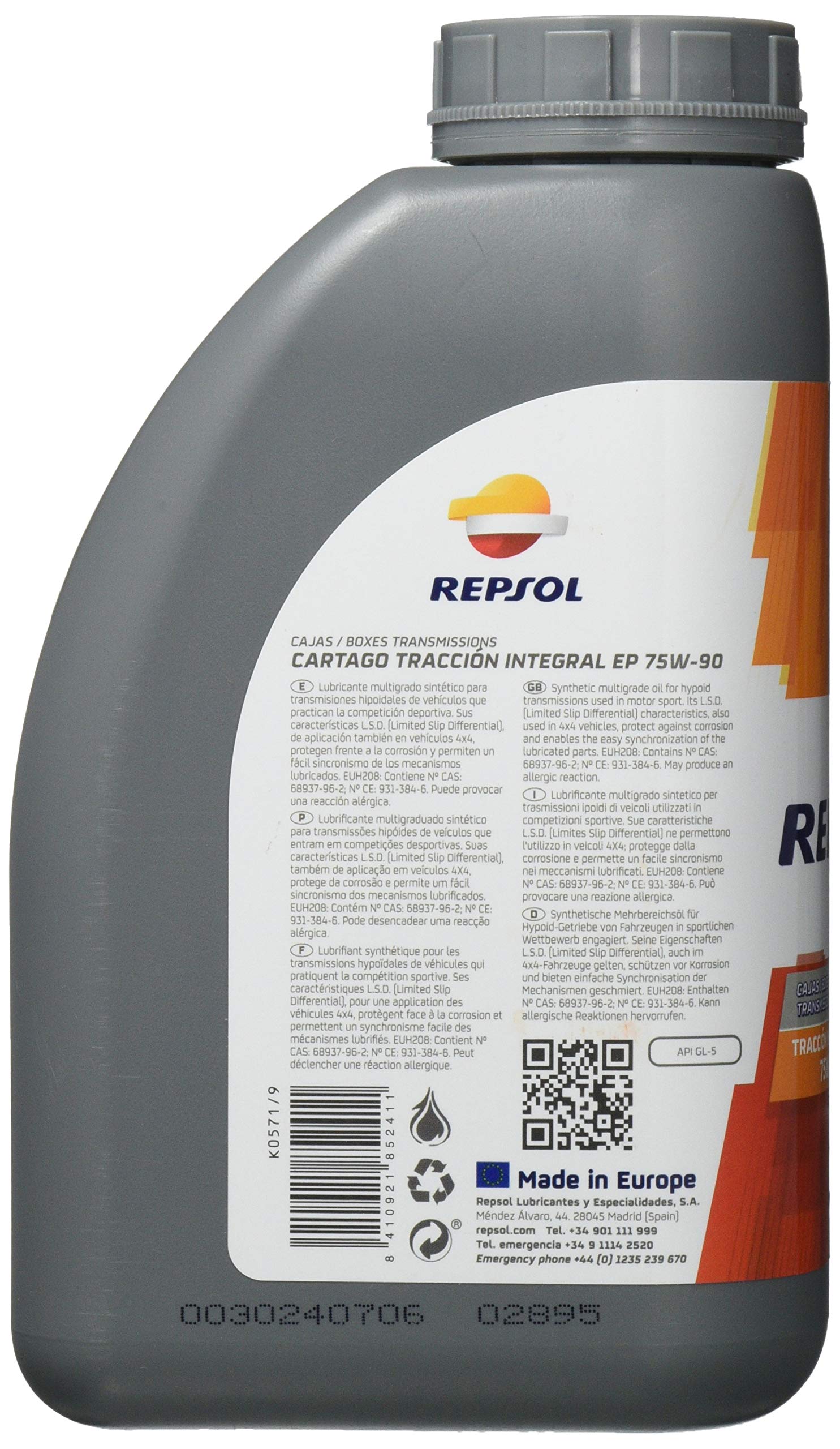 Dettagli: Lubrificante REPSOL Cartago Traccion Integral 75W90. Lubrificante sintetico multigrado con alta stabilità termica, indicato per trasmissioni e differenziali. Grande capacità di sopportazione di carichi e temperature elevate momentanee. Ottima resistenza all'invecchiamento. Eccellenti proprietà antiruggine e antischiuma. Buona fluidità a freddo e ottima viscosità ad alte temperature. Mantiene puliti gli ingranaggi, riducendo i costi di manutenzione. Specifiche e omologazioni: API GL-5, LSD. Confezioni da lt.1.
