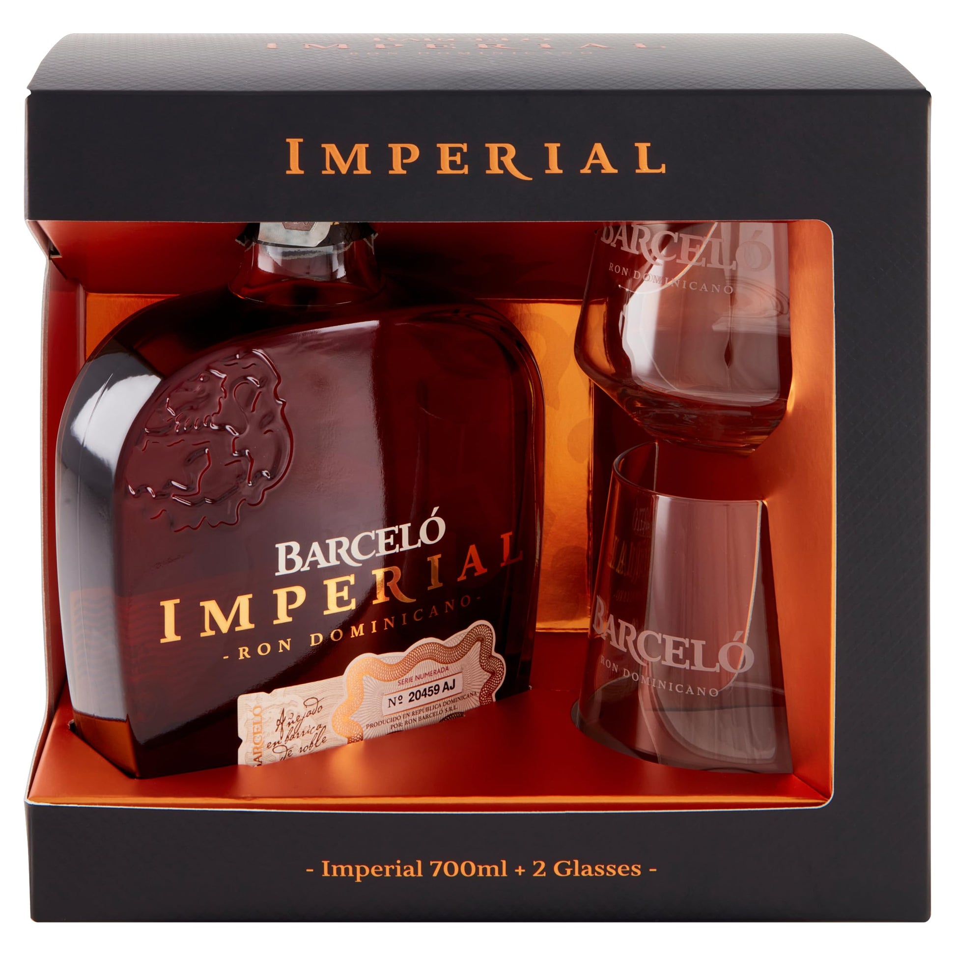 Ron Barceló Imperial – Idea Regalo, 2 Bicchieri da Degustazione e 1 Bottiglia di Rum Ambrato da 700 ml, Invecchiato Naturalmente fino a 10 anni, Rum Dominicano Pluripremiato