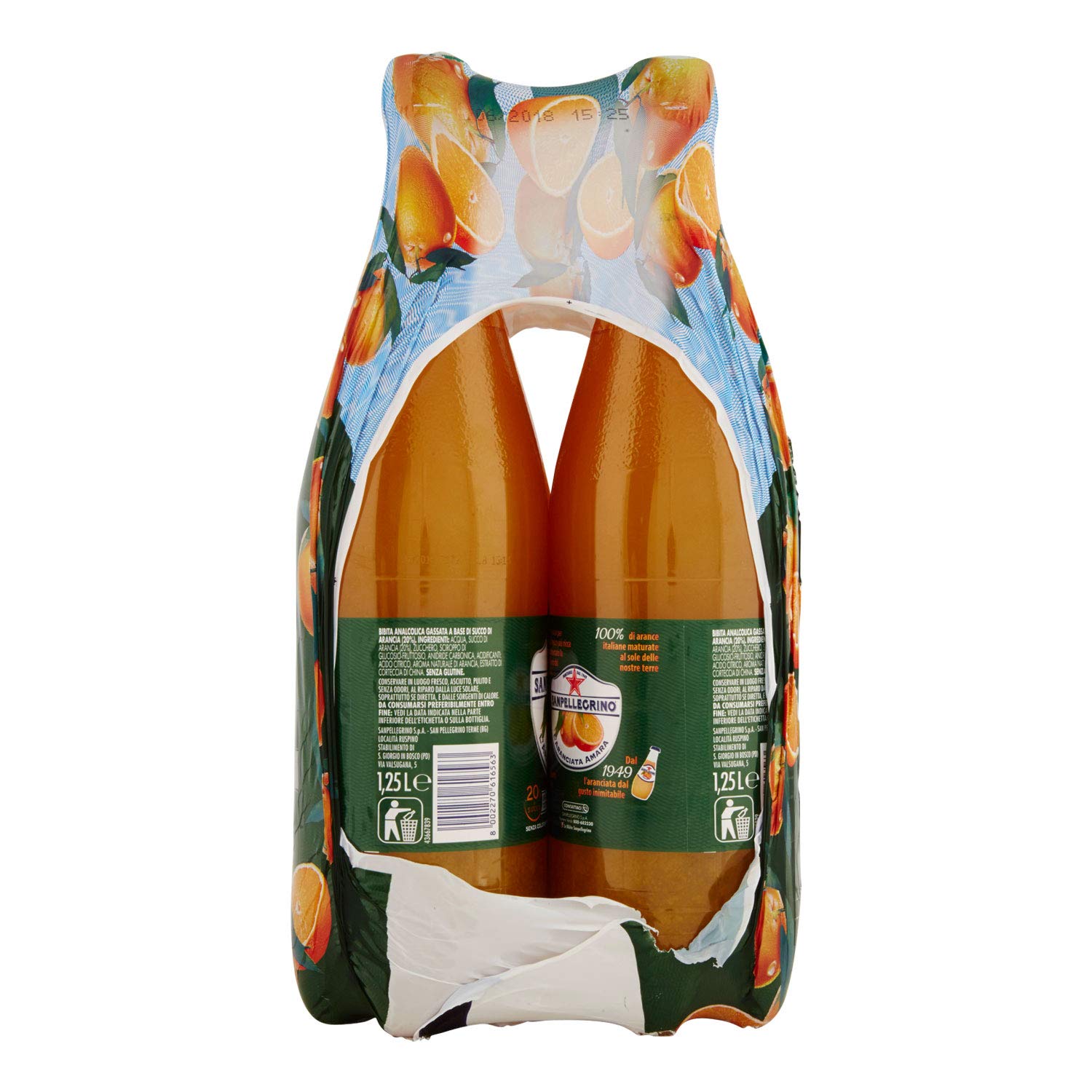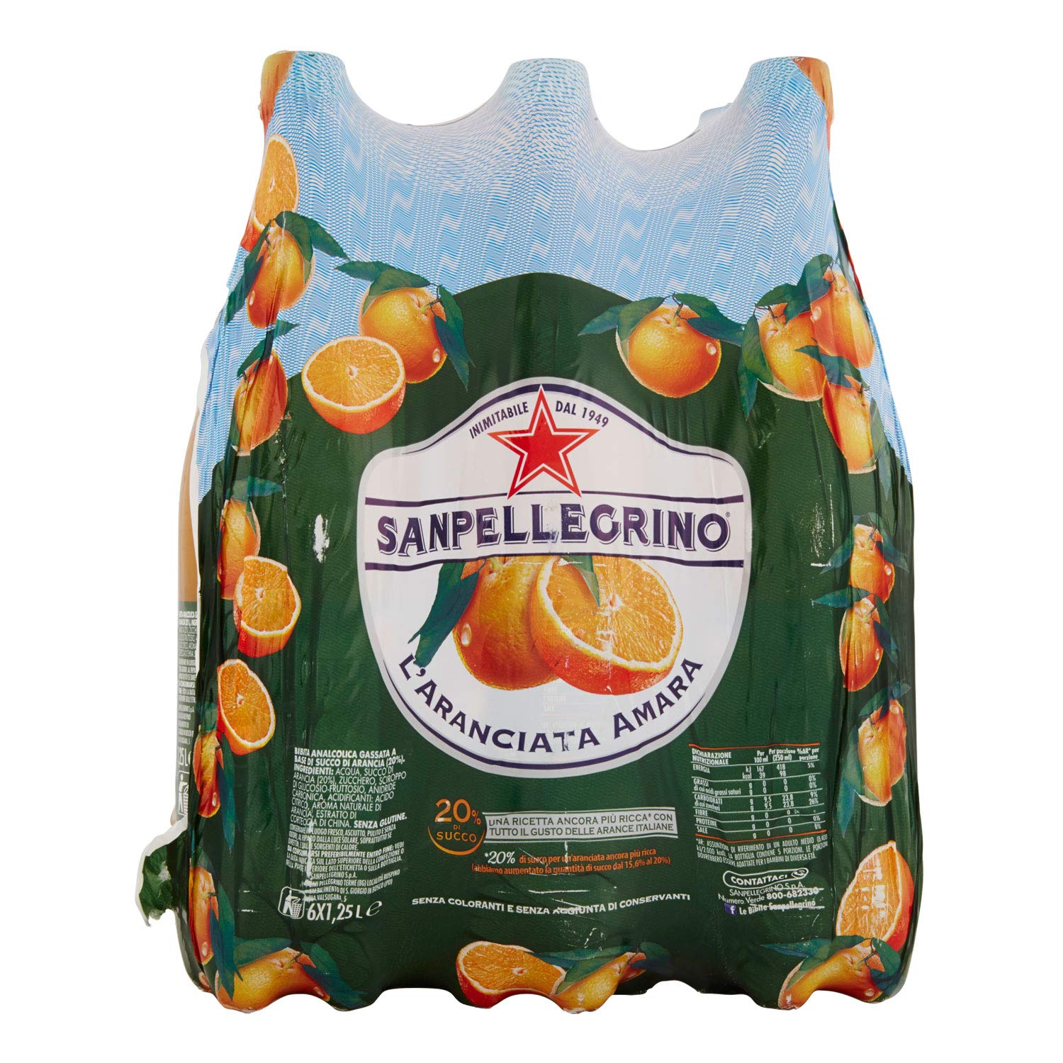 Dettagli: Descrizione Bibita analcolica gassata a base di succo di arancia (20%) Ingredienti Acqua, succo di arancia (20 %), zucchero, sciroppo di glucosio-fruttosio, anidride carbonica, acidificanti: acido citrico, aroma naturale di arancia, estratto di corteccia di china. Senza glutine. Indicazioni Conservare in luogo fresco, asciutto, pulito e senza odori, al riparo dalla luce solare, soprattutto se diretta e dalle sorgenti di calore. Contenuto della confezione 6 Bottiglie PET da 1,25L cad