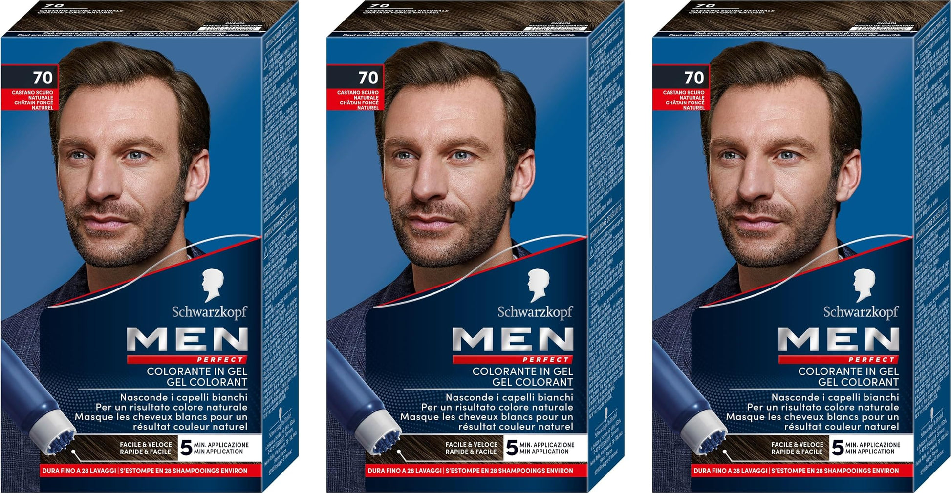Schwarzkopf, Men Perfect, Tinta Colorante in Gel, Copertura dei Capelli Bianchi, Risultato Effetto Naturale, Dura Fino a 28 Shampoo, Tonalità 70 Castano Scuro Naturale, 3 confezioni