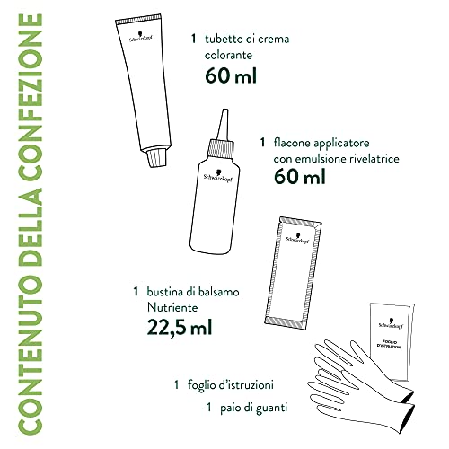 - Contenuto della confezione: 1 tubetto di crema colorante 60 ml, 1 flacone con emulsione rivelatrice 60 ml, 1 bustina di trattamento nutriente 22,5 ml, 1 paio di guanti, 1 foglietto d'istruzioni
