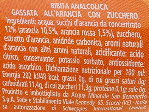 Dettagli: Ingredienti Acqua, Zucchero, Succo d'arancia (2%) da concentrato, Anidride carbonica, Acidificante: acido citrico, Conservante: potassio sorbato, Aromi naturali di agrumi (arancia, pompelmo, limetta e mandarino) con altri aromi naturali, Stabilizzanti (E1450, E445), Antiossidante: acido ascorbico