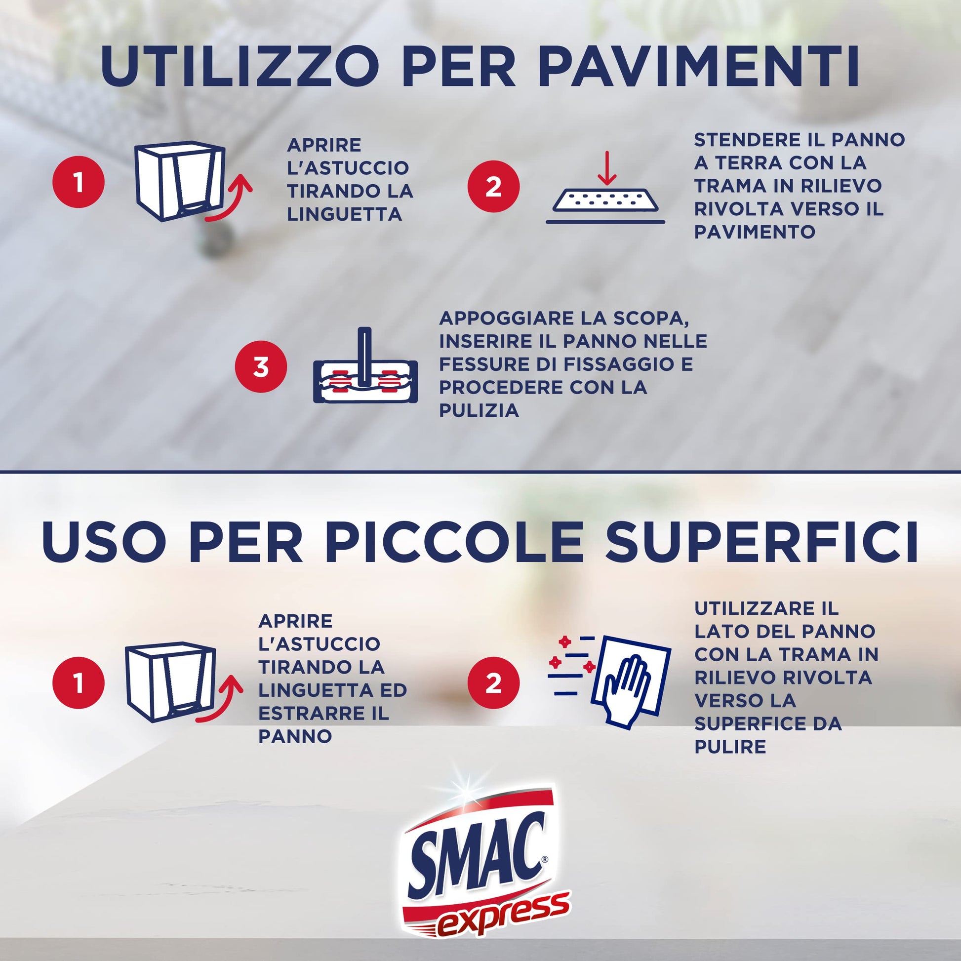 - Prodotto: Smac Express Cattura Polvere 10+ puliscono efficacemente pavimenti e superfici della casa, grazie alla presenza di oltre 700.000 fibre cattura sporco