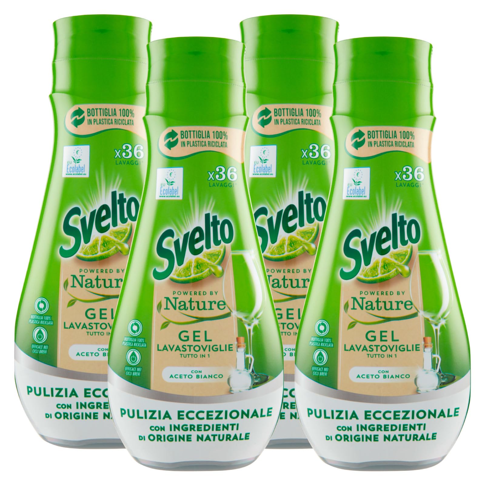 Svelto Powered By Nature Gel Tutto in 1 per Lavastoviglie Pulizia Eccezionale con Aceto Bianco e Ingredienti di Origine Naturale - 4 Flaconi da 640ml