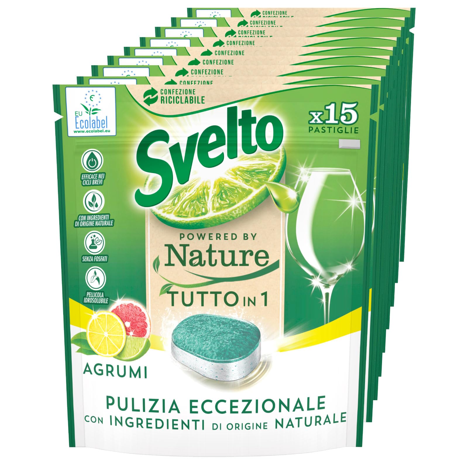 Svelto Powered By Nature Tutto in 1 Pastiglie Lavastoviglie Pulizia Eccezionale Profumo Agrumi Azione Sgrassante Idrosolubili con Ingredienti di Origine Naturale - 9 Confezioni da 15 Pastiglie