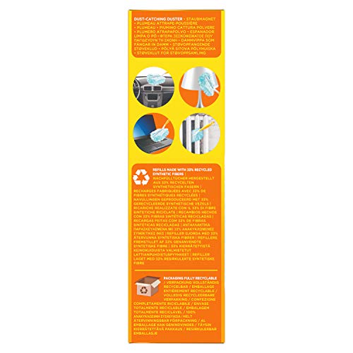 Dettagli: Indicazioni Prima dell'uso: Agitare il magnete antipolvere Swiffer per creare l'effetto "ratina" e aprire le fibre prima di passare le due aste del manico antipolvere attraverso le fessure sul retro dei panni per il magnete antipolvere. Prova anche il lavapavimenti Swiffer per pulire in un batter d'occhio i pavimenti e persino le superfici difficili da raggiungere. Descrizione Le ricariche per piumini Swiffer catturano e bloccano la polvere, i peli e gli allergeni provenienti dagli acari della polvere, ma anche da gatti e cani, grazie alle loro migliaia di morbide fibre leggermente rivestite. I panni Swiffer sono fatti di fibre che cambiano forma per penetrare negli angoli e nelle fessure, permettendovi così di sbarazzarvi di polvere e peli praticamente su qualsiasi superficie senza spargerli per tutta la casa. È particolarmente adatto a raccogliere i peli degli animali, dato che la maggior parte di questi perdono peli di continuo. È adatto anche per chi soffre di allergia alla polvere. Usate le ricariche per piumino catturapolvere Swiffer con il manico Swiffer Duster (venduto separatamente).