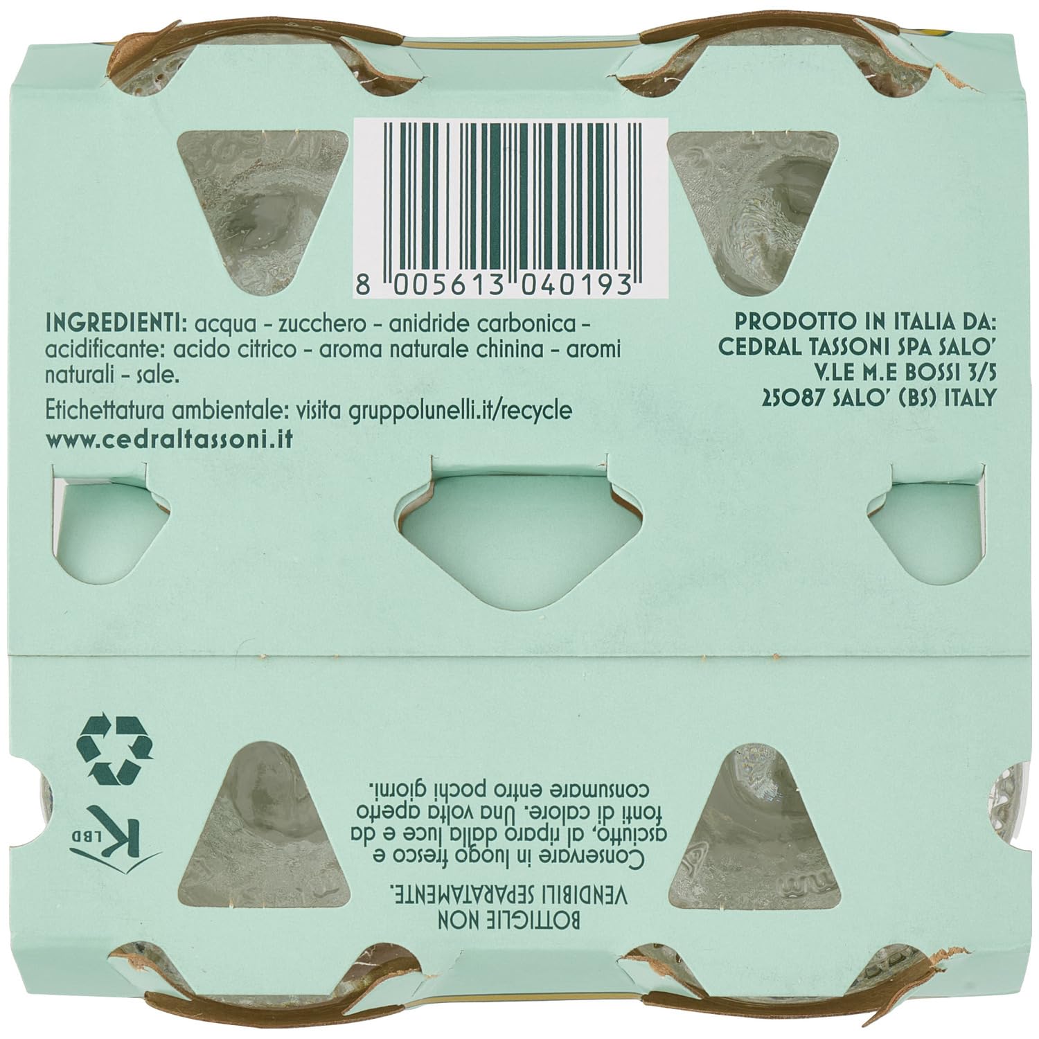 Dettagli: Descrizione Descrizione prodotto TASSONI SUPERFIN18CLX4 Ingredienti Acqua zucchero anidride carbonica acidificante: acido citrico aroma naturale chinina aromi naturali sale. Ingredienti Acqua zucchero anidride carbonica acidificante: acido citrico aroma naturale chinina aromi naturali sale. Avviso di sicurezza Solo per uso esterno. Evitare il contatto con gli occhi. Tenere lontano dalla fiamma nuda diretta o da fonti di calore.