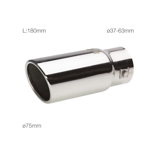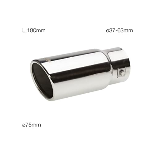 Dettagli: Terminale di scarico universale in inox, rotondo, uscita inclinata. Lunghezza 180 mm - diametro entrata 37-63mm - diametro uscita 75 mm. Fissaggio con bulloni