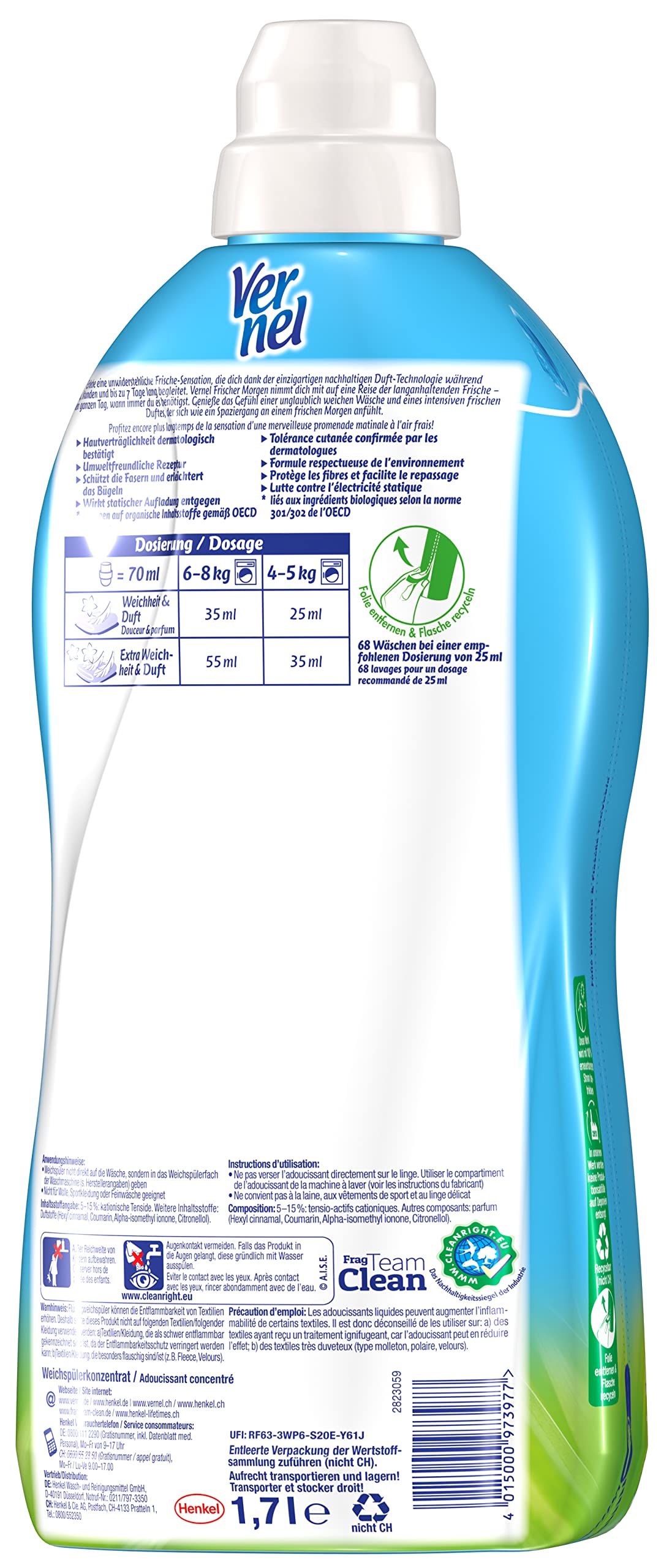 - L'ammorbidente Vernel Frischer Morgen vi coccola con momenti di freschezza grazie alla biancheria incredibilmente morbida e alla particolare sensazione di freschezza fino a 140 giorni* di lunga durata