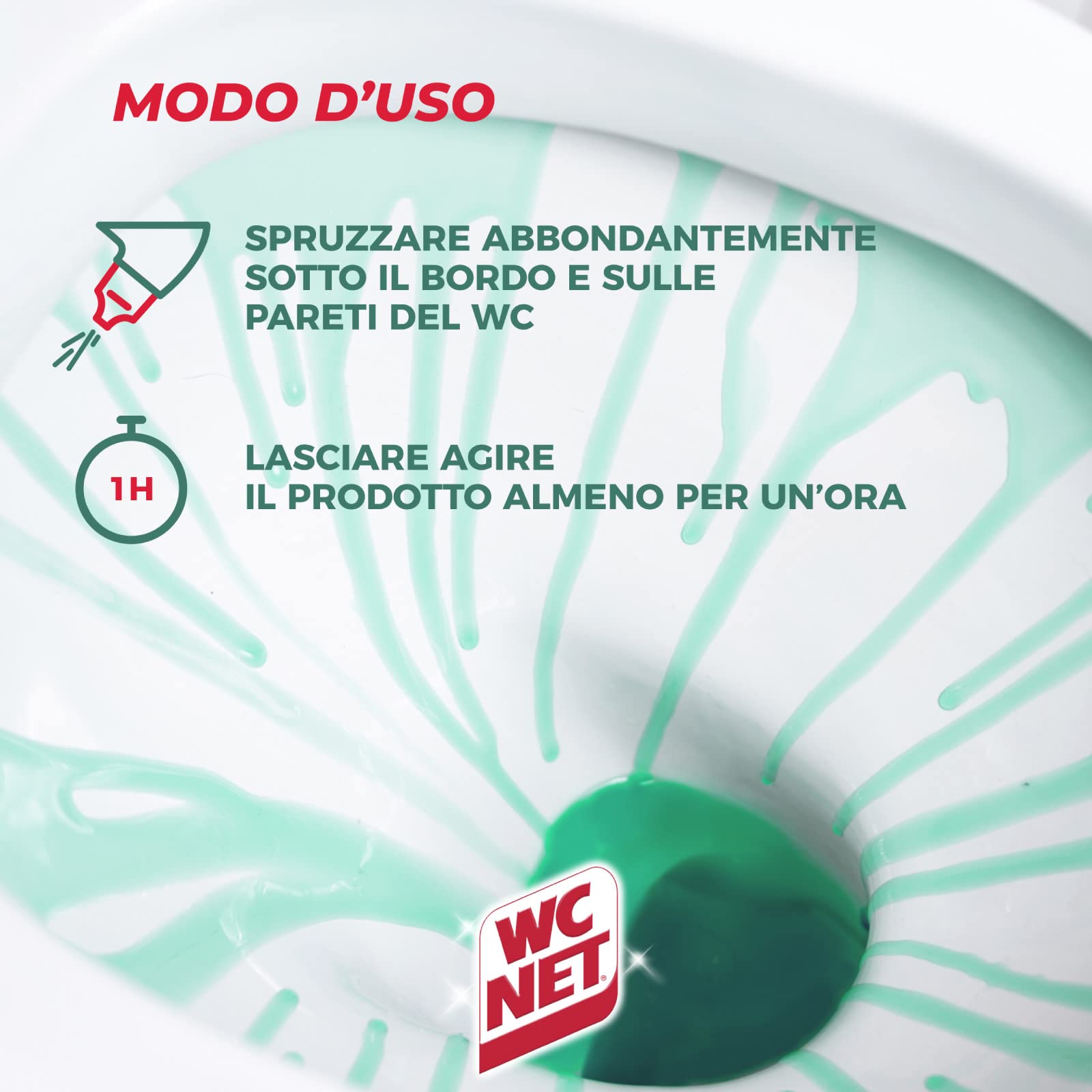 - Modalità d’uso: spruzzare abbondantemente WC Net disinfettante disincrostante sotto il bordo e sulle pareti del wc. Lasciare agire il prodotto almeno un'ora. Per incrostazioni più resistenti lasciare agire il prodotto tutta la notte