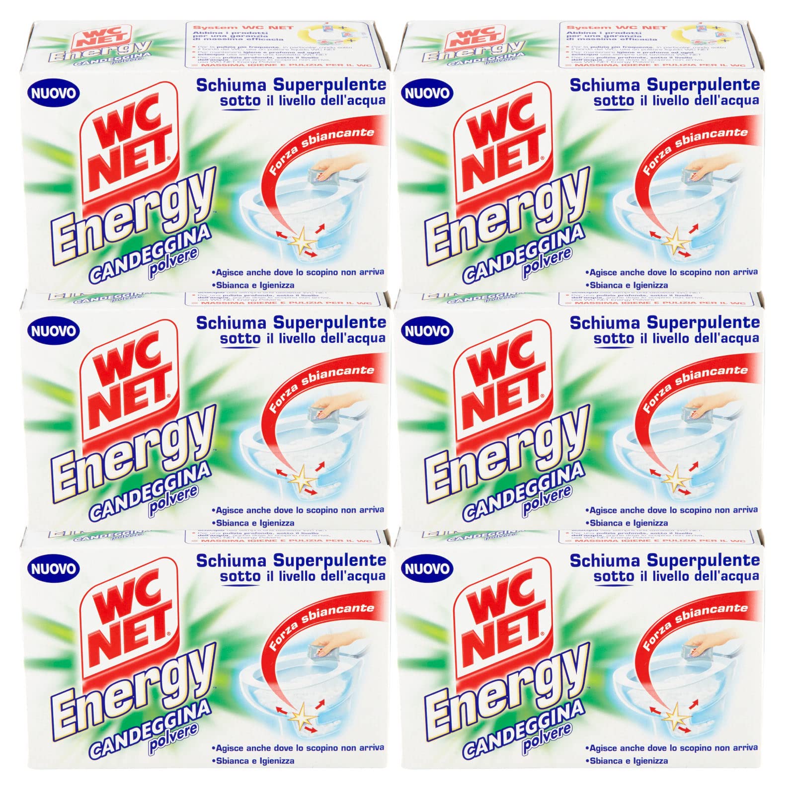 Wc Net - Energy con Candeggina, Detergente Igienizzante in Polvere per WC, Schiuma Autopulente con Azione Sbiancante, 4 Buste x 6 Confezioni