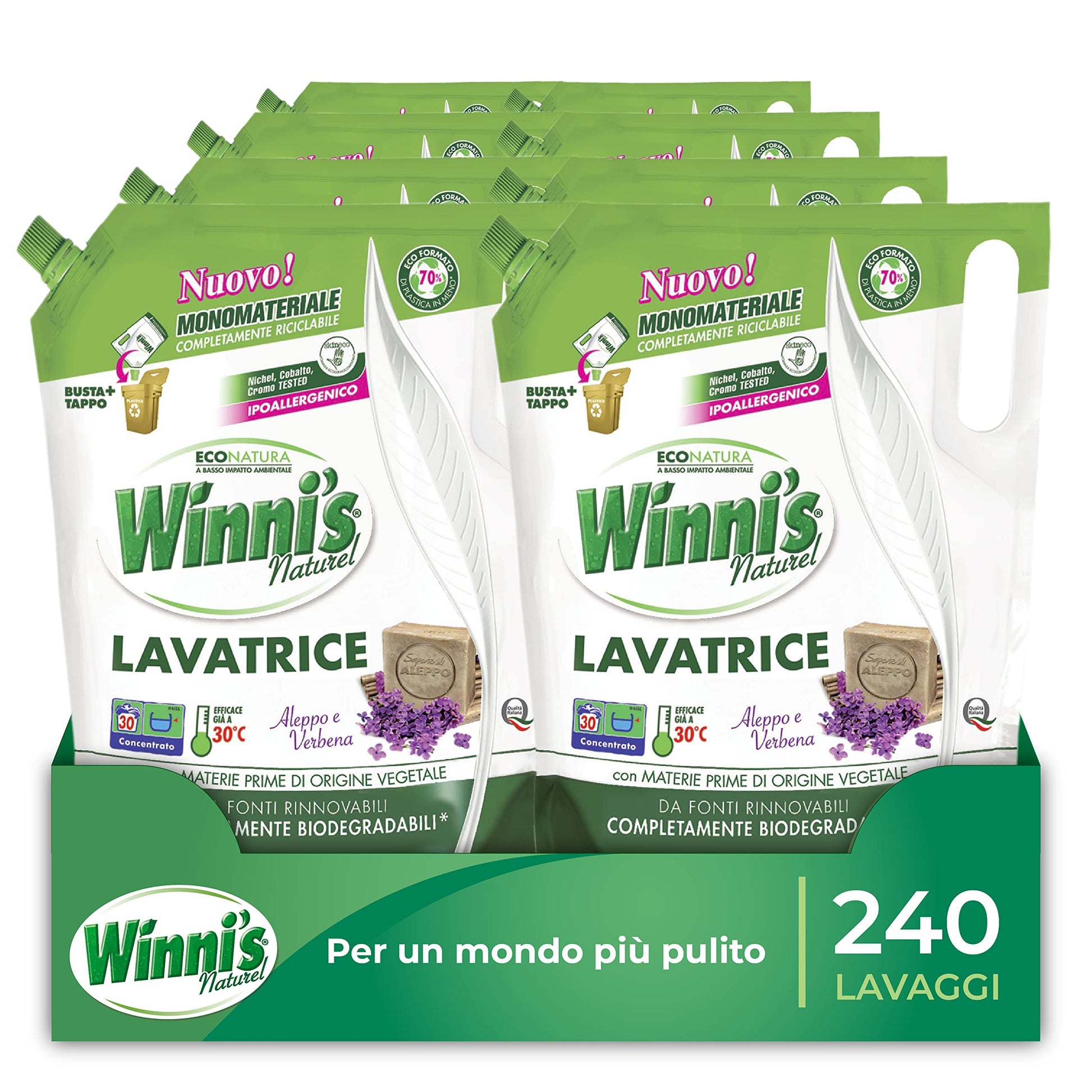 Winni's - Detersivo Lavatrice Ipoallergenico in Ecoformato, 240 Lavaggi, Adatto alle Pelli più Sensibili, Fragranza Aleppo e Verbena, con Materie Prime di Origine Vegetale, 1500 ml x 8 Confezioni